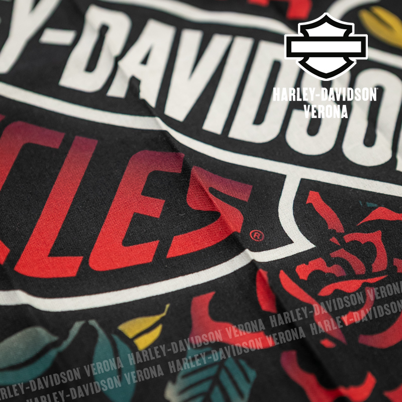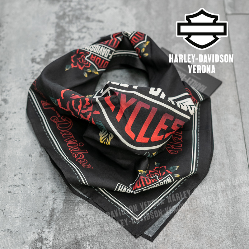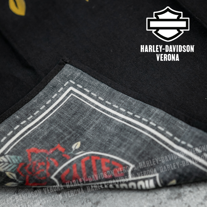 Unisci la tua anima da motociclista a uno stile floreale! Questa bandana è realizzata in puro cotone 100% sottoposto a lavaggio ammorbidente per essere il più confortevole possibile durante i viaggi. Dimensioni standard 56 cm x 56 cm, è abbellita dalla scritta del nostro logo e dalle rose che avvolgono il leggendario stemma Bar & Shield, offrendo un colpo d’occhio unico.