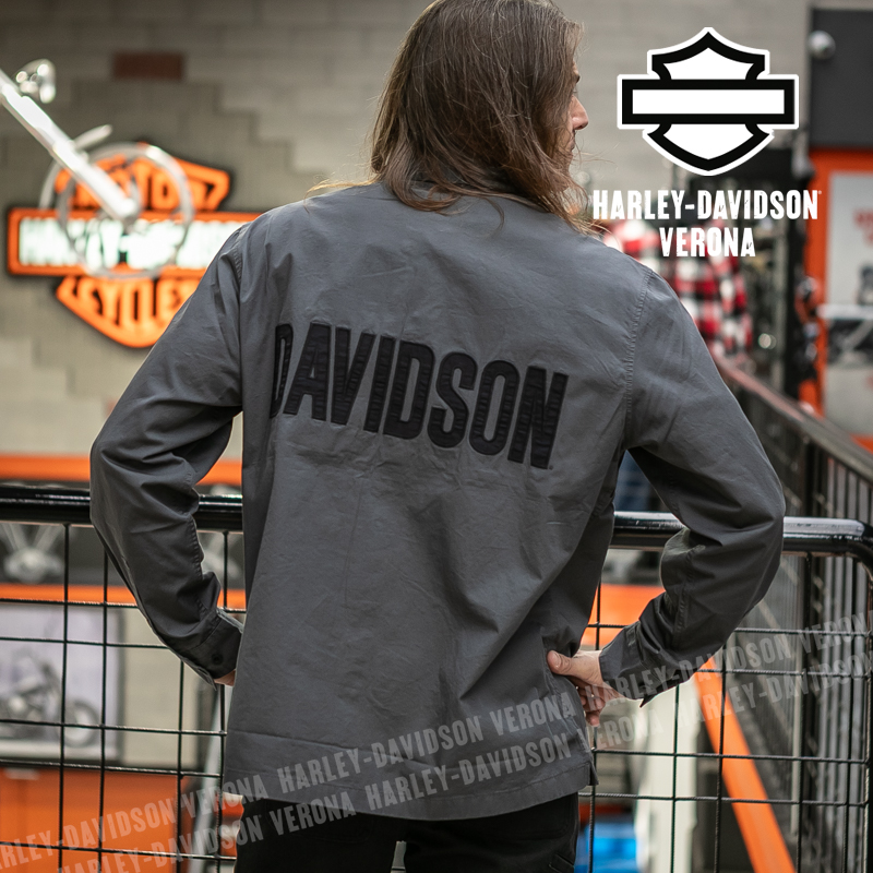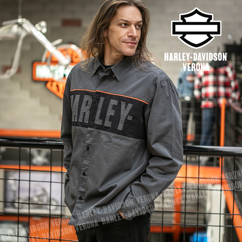Un modello che si ispira all’abbigliamento tipico da officina, questa bella camicia da uomo è realizzata in twill di cotone di medio spessore, al tempo stesso robusto e traspirante, sottoposto a lavaggio ammorbidente per darle un morbido aspetto vissuto. Il taglio è leggermente più corto e abbondante rispetto a una camicia normale, ha spacchi laterali ed è dotata di tasche con chiusura a pressione e di colletto con bottoni automatici nascosti. La composizione a contrasto, i profili e le grafiche danno questa camicia un’estetica H-D inconfondibile. Timothy è alto 180 cm e indossa la taglia L.