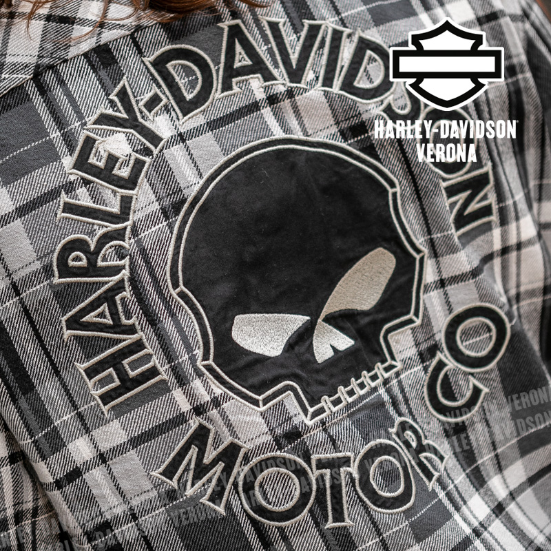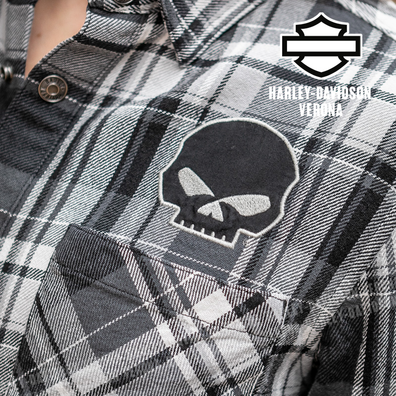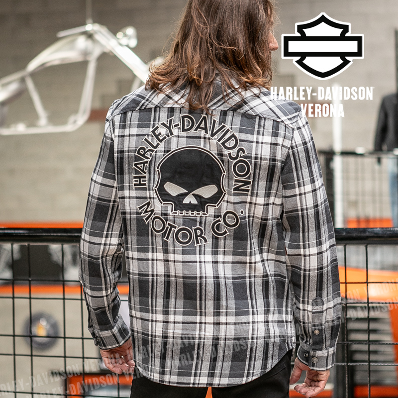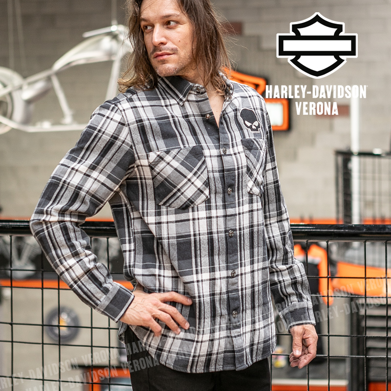 Nella camicia Willie G™ Skull, il classico motivo scozzese si fonde con una vera e propria leggenda della creatività. Realizzata in pesante twill di cotone, robusto ma traspirante, questa camicia da uomo ha un colletto con bottoni automatici nascosti che rimane a posto anche sotto gli indumenti tecnici. La camicia è rifinita con un’applicazione ricamata che raffigura il celebre teschio di Willie G™ Skull. Benché proprio il teschio sia una delle creazioni più famose di Willie G. Davidson, questo genio poliedrico firmò anche diverse motociclette, tra cui la FX Super Glide® del 1971 e la Low Rider® del 1977.