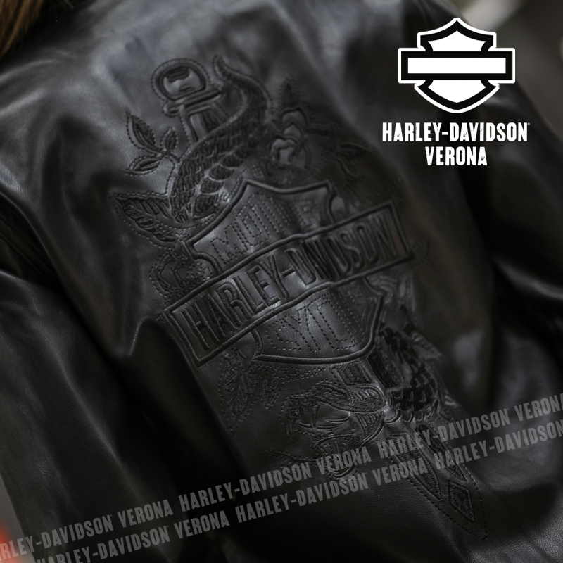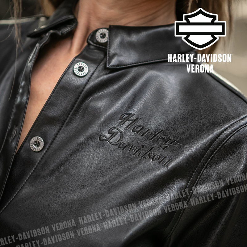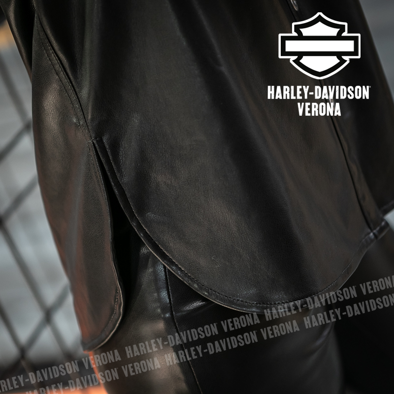 Questa camicia in pelle incarna lo stile ribelle della vera motociclista! È realizzata in ecopelle di poliestere pesante, resistente ma più facile da pulire rispetto alla vera pelle, ha l’orlo ricurvo con spacchetti laterali per maggiore mobilità e il colletto con bottoni automatici per non svolazzare sotto gli indumenti tecnici. Chiusura frontale e sui polsini a bottoni, abbottonatura a pressione nascosta sulle maniche. È rifinita con un ricamo tono su tono sul davanti, mentre sulla schiena campeggia l’immagine del serpente che incontra la rosa con un pugnale, un ensemble di grande impatto visivo. Cristina è alta 165 cm e indossa la taglia XS.