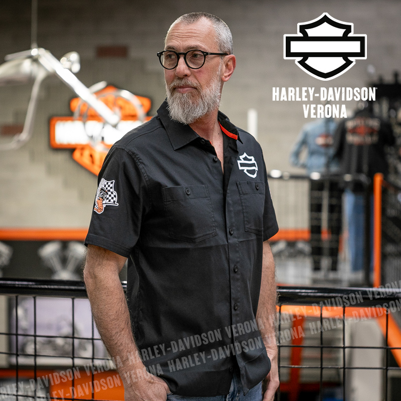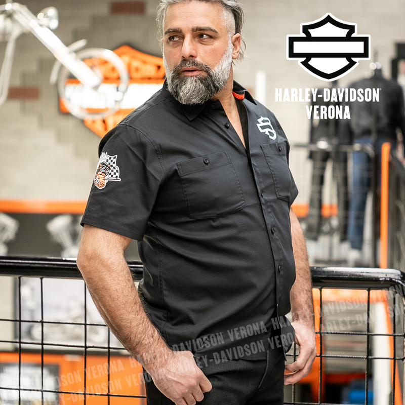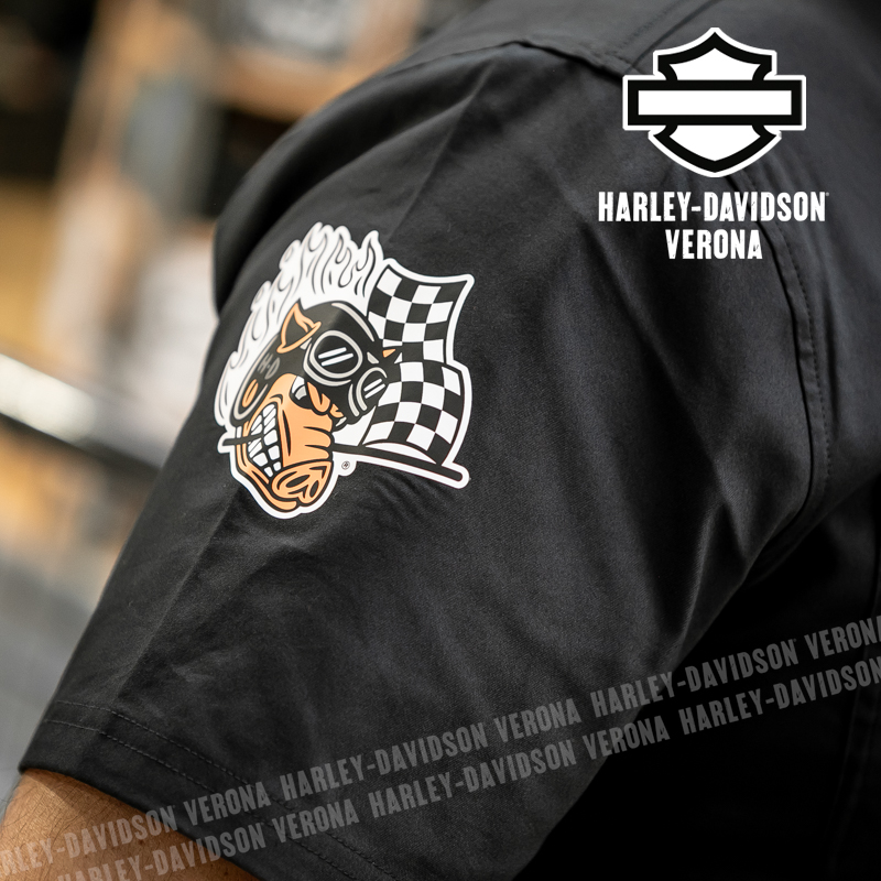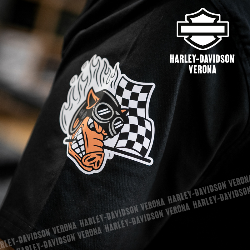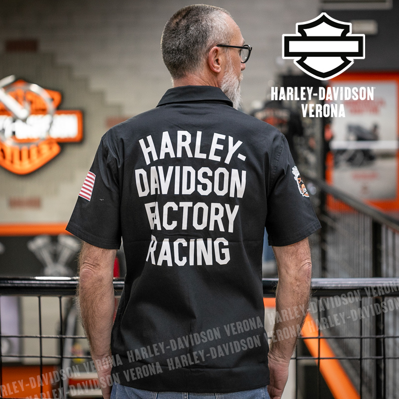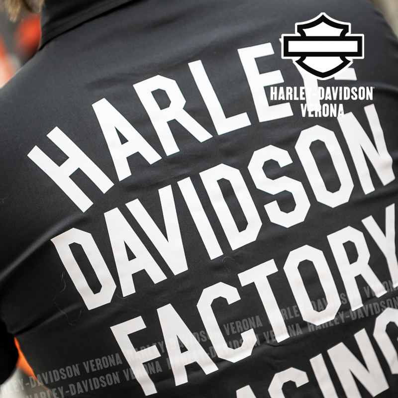 L’iconica collezione Factory Racing Team è tornata, con questa camicia UNISEX a maniche corte in 100% cotone, classico nero Harley, abbellita da grafiche scritte in bianco sulla schiena ed etichette ricamate e applicate. Acchiappala al volo, prima che finisca!