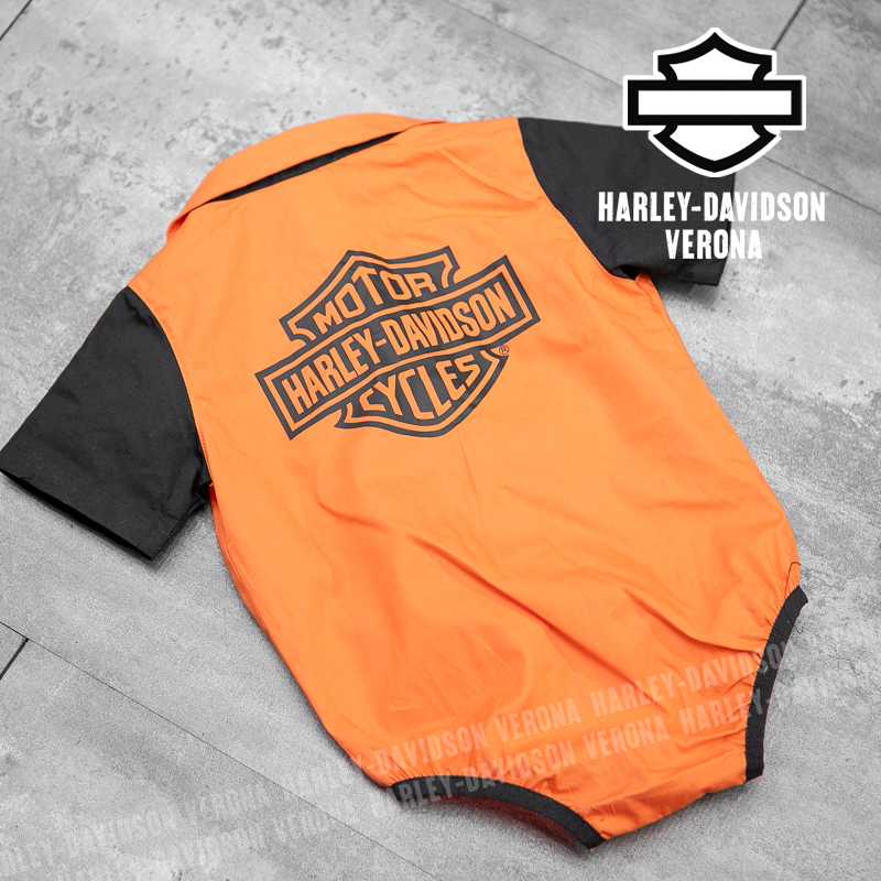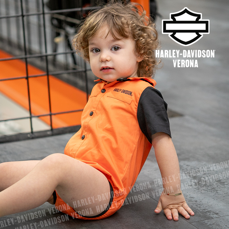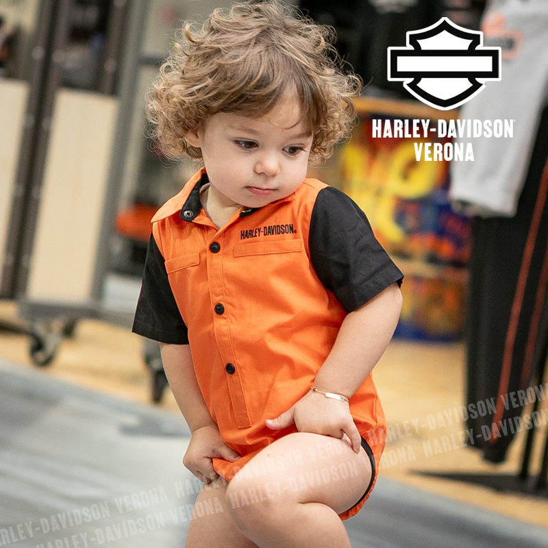 Simpaticissima camicina-body, realizzata in fresco popelin di cotone 100% con colletto in vero stile “racing”, chiusura con quattro bottoni automatici davanti e pratica abbottonatura al cavallo. Elastico al giro gamba per una vestibilità super confortevole. Scritta Harley-Davidson sul cuore e classico Bar & Shield nero sulla schiena. Eva ha due anni e indossa una taglia 12/18 mesi.