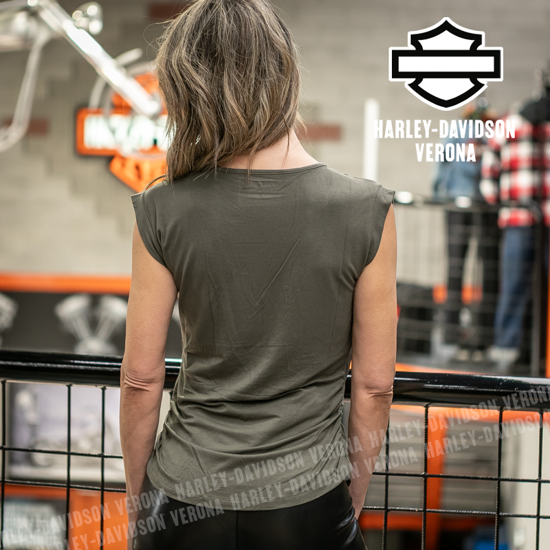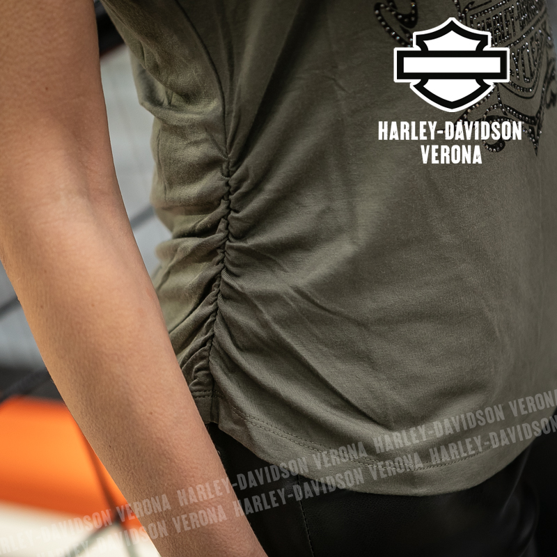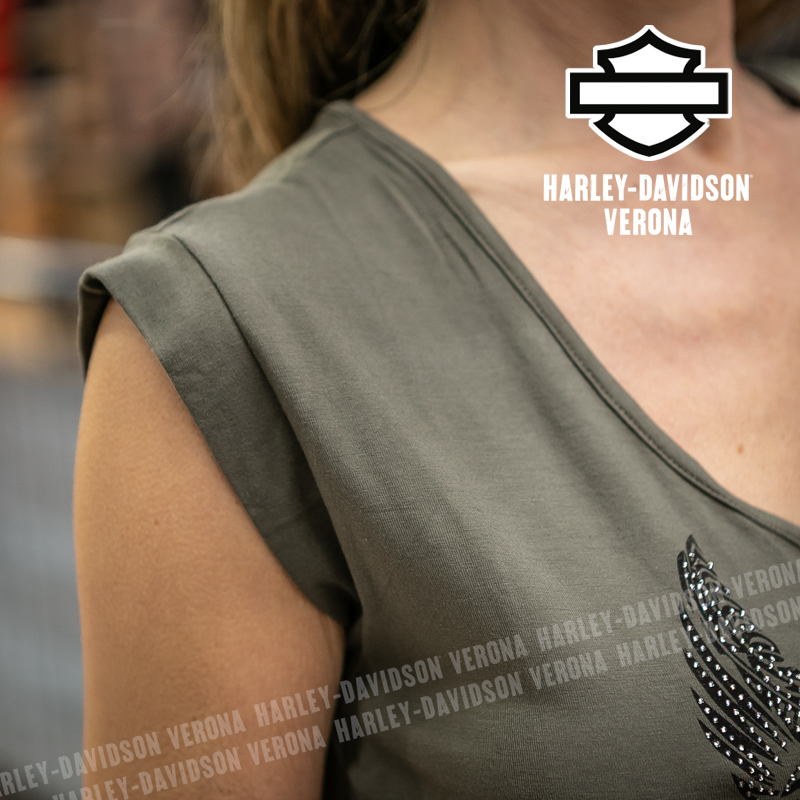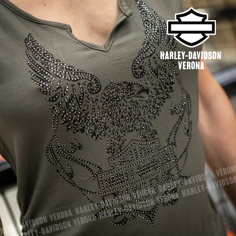 Il tuo stile da motociclista spicca davvero il volo con questa canotta in edizione limitata! Realizzata in jersey di rayon pesante (225 g/m²) 95% per una sensazione di morbidezza e comfort a lunga durata, con un 5% di Spandex per una maggiore elasticità. Progettata per valorizzare la figura femminile, ha una scollatura ampia con intaglio ed è abbellita da un’arricciatura sulle cuciture laterali. La sua esclusiva grafica tempestata di strass si ispira al nostro design con l’aquila Bar & Shield del 1976, creato per il Bicentenario degli Stati Uniti. Aggiungila subito al tuo guardaroba! Cristina è alta 165 cm e indossa la taglia XS.