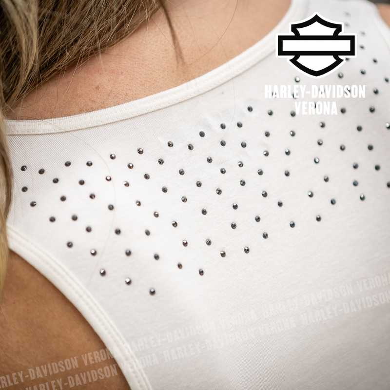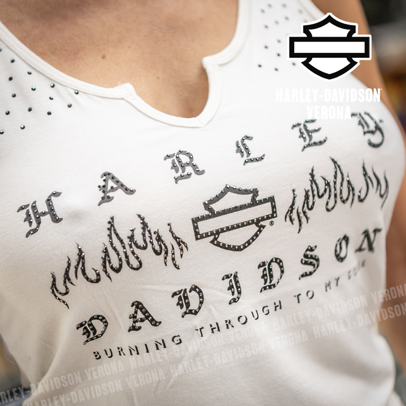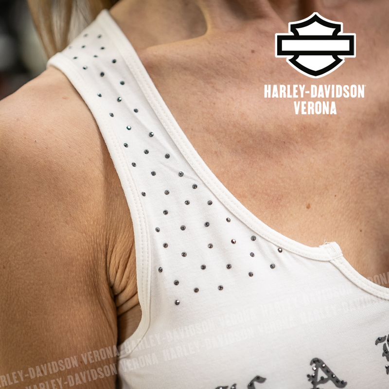 La tua passione per lo stile di vita motociclistico è radicata in questa canotta Slow Burn dalla bellissima scollatura a intaglio! Quest’edizione speciale è realizzata per garantirti un comfort duraturo grazie al jersey di rayon da 225 g/m² con un tocco di Spandex per una maggiore elasticità. Presenta una scollatura a punta con cascata di strass sul davanti. Ulteriori dettagli in strass arricchiscono la grafica personalizzata che illumina la parte anteriore. Ordinala prima che sia troppo tardi! Cristina è alta 165 cm e indossa la taglia XS.