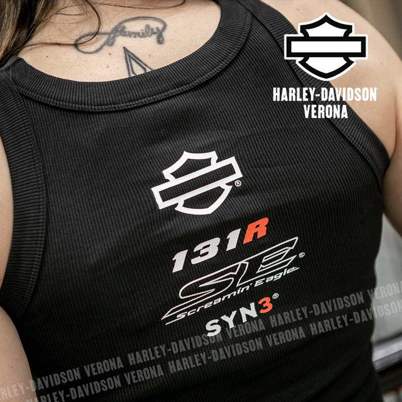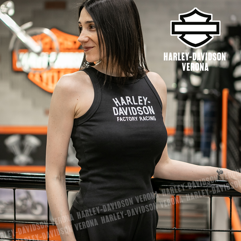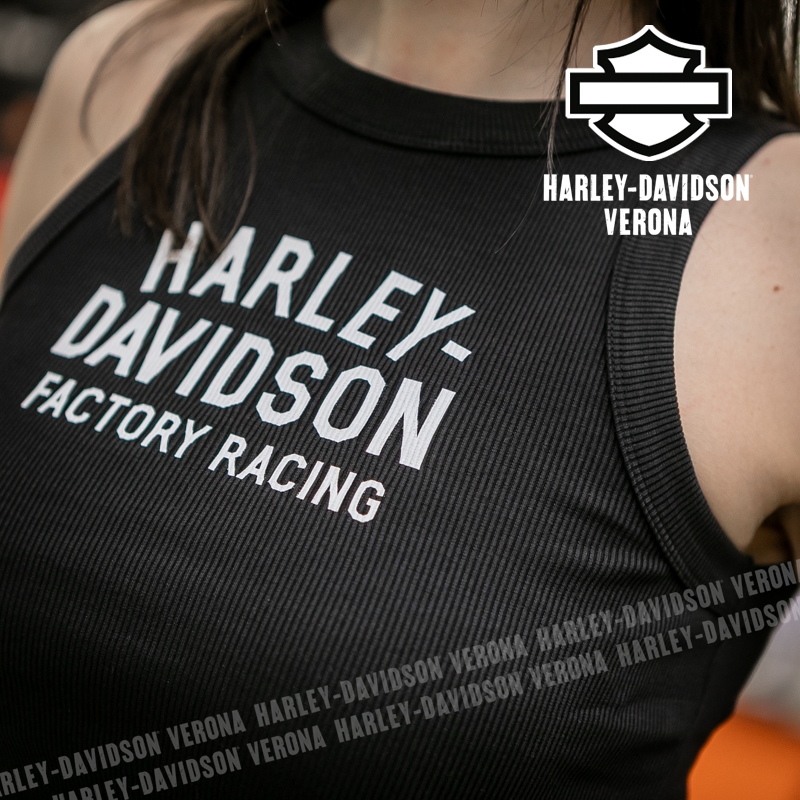 Torna la collezione Factory Racing Team con una canotta da donna dal colore nero, scuro come una corsa nella notte, intenso come la tua passione Harley-Davidson. Realizzata in morbido tessuto in un taglio sportivo che valorizza la silhouette femminile, ha grafiche stampate a mano morbida in perfetto stile Harley. Vestibilità piccola. Pronta a farti accarezzare dal vento dell’estate?