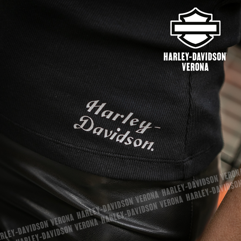 La canotta Lace Up ti permette di affrontare le giornate più calde senza perdere sensualità! Realizzata in tessuto misto cotone 58% emodal 38% garantisce il massimo del comfort per tutte le ore e i chilometri che ti servono. Le fibre di spandex 4% aggiungono quel tanto di elasticità e la struttura a coste 2×2 le dà dimensione. Questa canotta da donna, caratterizzata da un taglio più corto e aderente, ha un profondo scollo a V, le spalline sottili e i laccetti sul davanti. Vicino all’orlo è appena visibile il marchio H-D realizzato a stampa metallica, per uno stile versatile che si abbina alla perfezione con qualsiasi capo del guardaroba. Cristina è alta 165 cm e indossa la taglia XS.