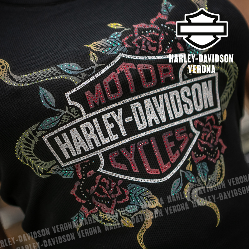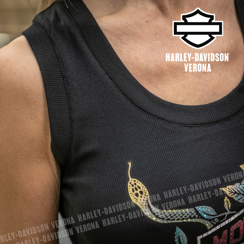 Un modello squisitamente estivo ravvivato da un tocco scintillante. Realizzata in tessuto a costine 2×2 misto 58% cotone, 38% Modal e 4% Spandex per donare morbidezza e traspirabilità. La canotta è in costina per offrire un look più consistente e si distingue per lo scollo valorizzante e la grafica del serpente e della rosa, impreziosita da strass. Scollo e giromanica con bordatura risvoltata, orlo con risvolto.