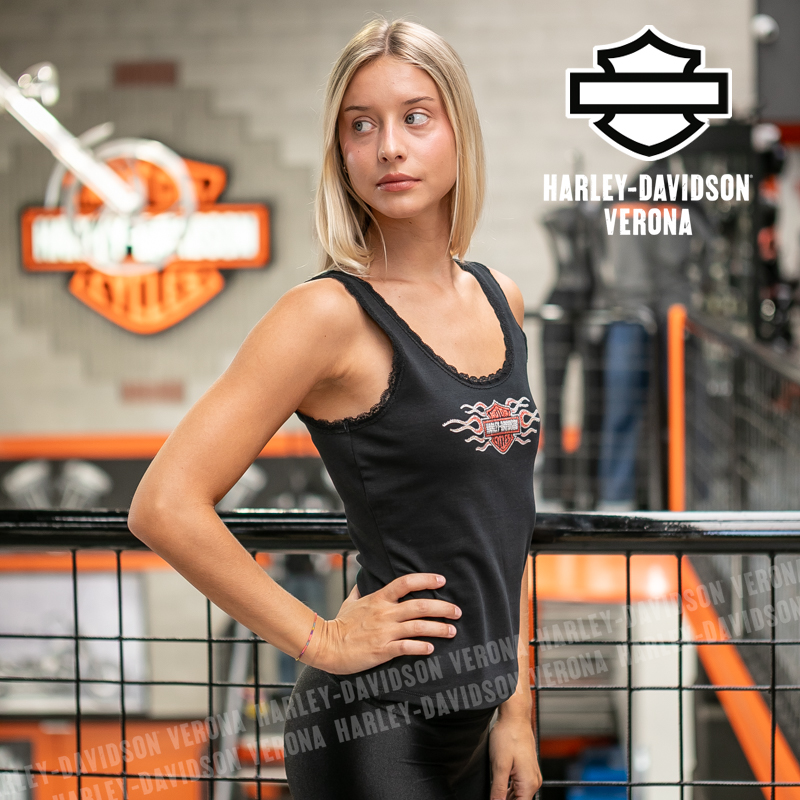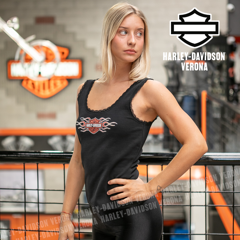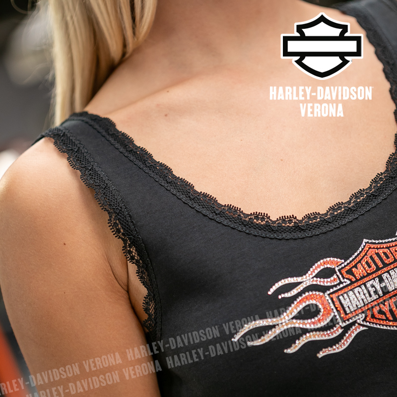 Accendi il tuo guardaroba con la canotta Harley-Davidson Vintage Flames Bling Lace Trim! Questa canotta da donna unisce un audace carattere motociclistico a dettagli femminili come il taglio aderente e il pizzo, rendendola un capo eccezionale per ogni occasione. Realizzata in tessuto morbido e leggero di cotone con un po’ di Spandex, ti dà il massimo del comfort per tutto il giorno, in viaggio o in relax. Perfetta da abbinare a jeans, pantaloncini o sotto la tua giacca Harley preferita, è una combinazione di stile e praticità essenziale per motocicliste e fan.