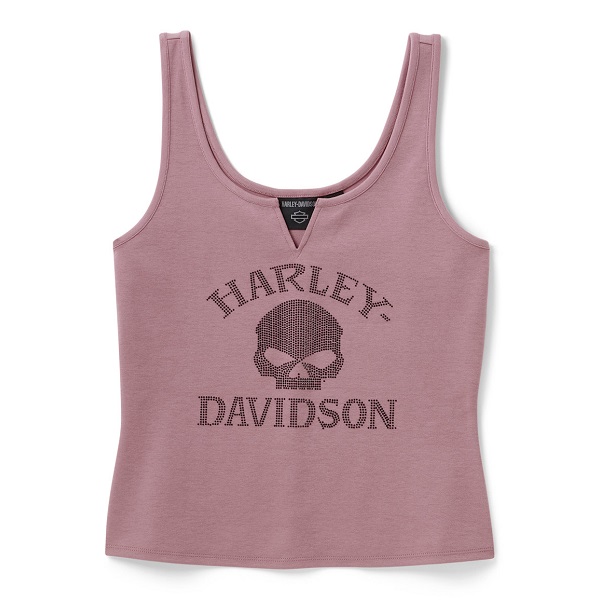 Rendi il tuo look sempre fresco con la canotta Willie G™ Skull Bling. È realizzata in 97% interlock di cotone traspirante con un tocco di spandex per una maggiore elasticità, il tutto in una silhouette dalla linea più corta. Questa canotta da donna ha la scollatura a punta sul davanti e scollo rotondo sul retro, oltre a una grafica scintillante di strass. Un po’ di storia: sebbene lo Skull sia una delle sue creazioni più popolari, Willie G. Davidson progettò anche diverse motociclette, tra cui il modello FX Super Glide® del 1971 e il modello FXS Low Rider® del 1977. Lunghezza 57cm dalla spalla all’orlo (in taglia M). Disponibile anche in bianco e in classico nero.