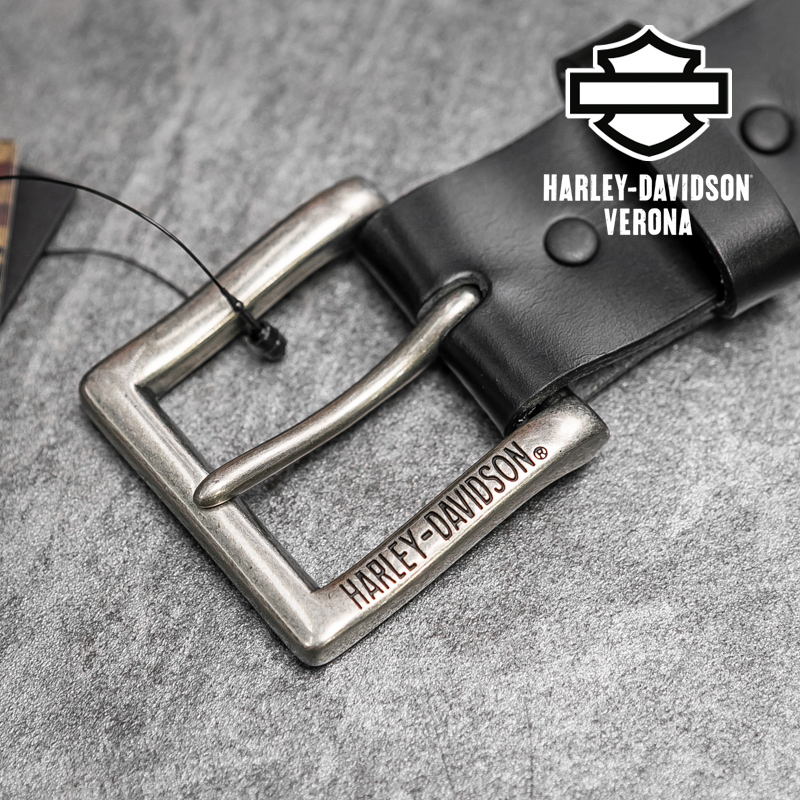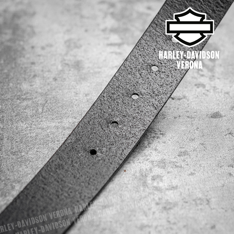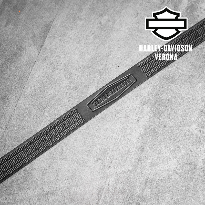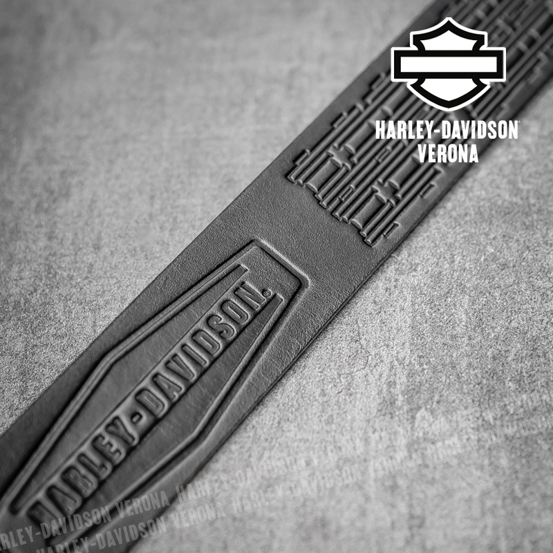 Cintura Harley-Davidson® da uomo in vera pelle di colore nero, finitura liscia con incisioni decorative e Bar & Shield allungato. Fibbia in metallo anticato con marchio inciso.