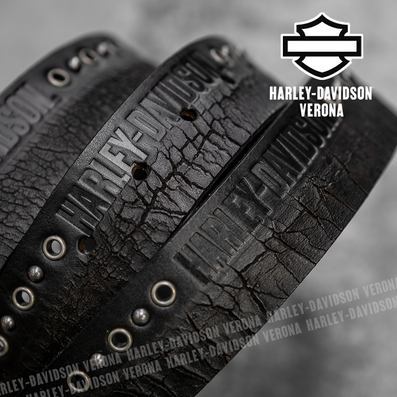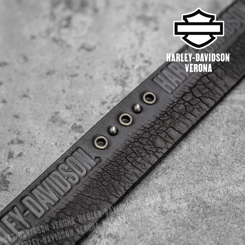 Cintura in vera pelle, di colore marrone scuro, con lavorazione ad effetto vintage, scritta Harley-Davidson incisa e applicazione di borchie e occhielli. Fibbia in metallo anticato.