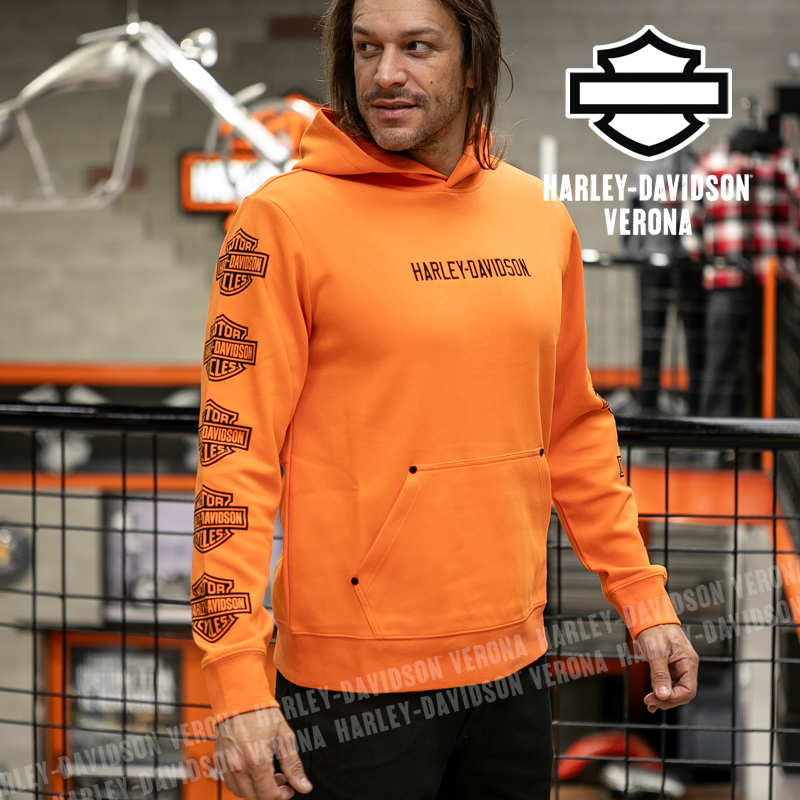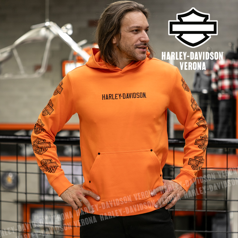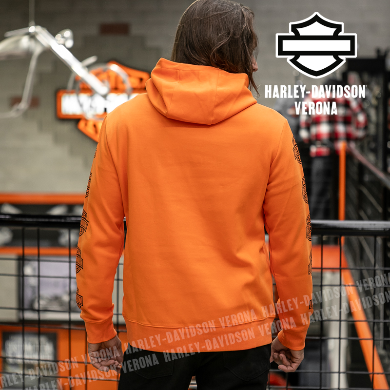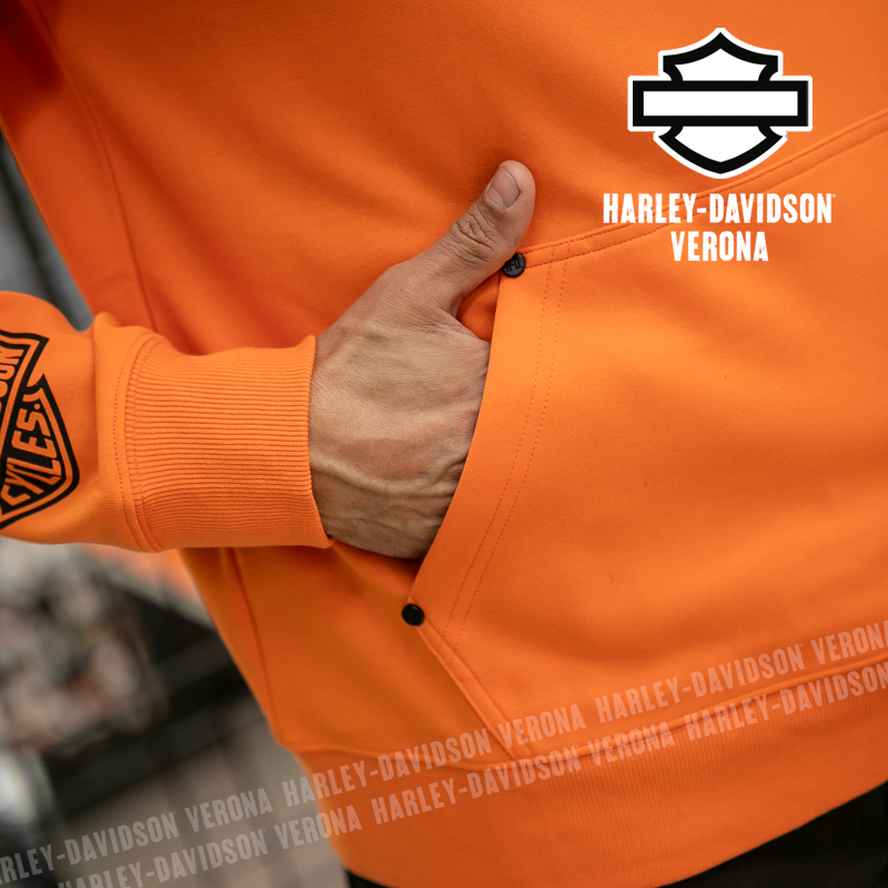 Il collaudato stile Harley è ciò che caratterizza la nostra felpa con cappuccio Essential Bar & Shield. Realizzata in un robusto e confortevole interlock di cotone 55% e e poliestere 45% dalla vestibilità comoda, ha tasca a marsupio, cappuccio foderato e sovrapposto e un rivetto sulla tasca a marsupio per un look raffinato. Polsi e orlo sono rifiniti a costine. La grafica è ricamata sul davanti e scende lungo entrambe le maniche con una stampa a mano morbida. Timothy è alto 180 cm e indossa la taglia L.