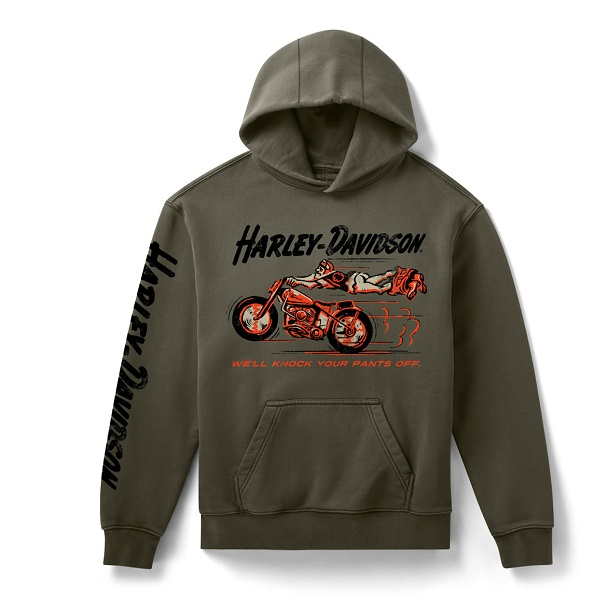 L’adrenalina della strada aperta: ecco perché la nostra felpa a cappuccio Knock Your Pants Off in edizione speciale è la scelta perfetta! È realizzata in pile di cotone 64% e poliestere 36% per un comfort avvolgente, con dettagli essenziali come un’ampia tasca a marsupio e un cappuccio con coulisse foderato in jersey. È rifinita con una grafica personalizzata e sfacciatissima, in perfetto stile Harley-Davidson, con uno stiloso effetto consumato per un look vintage. Non lasciartela sfuggire!