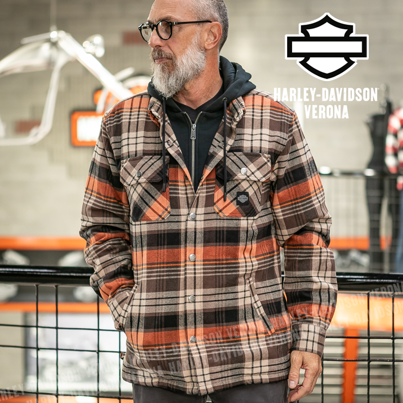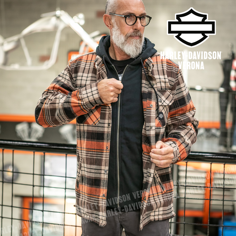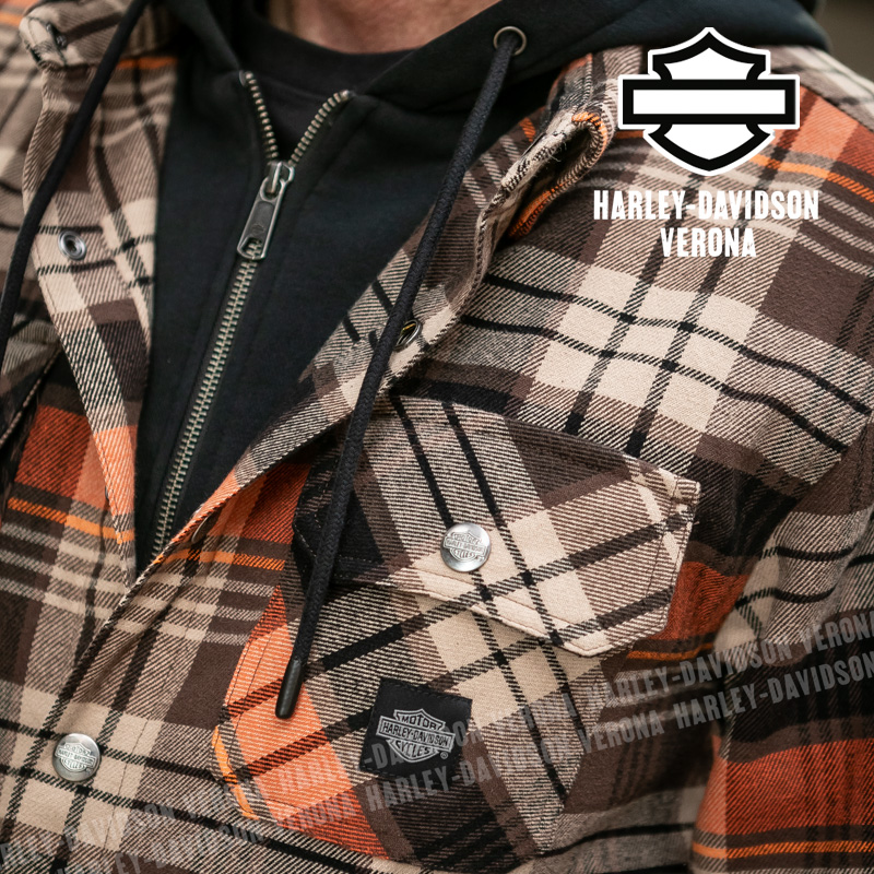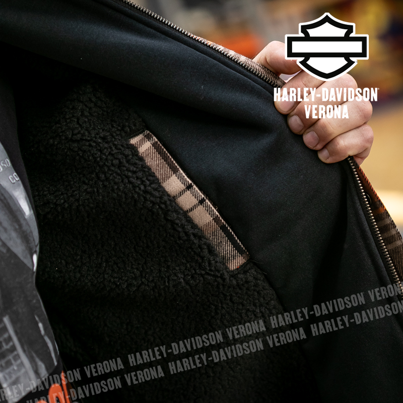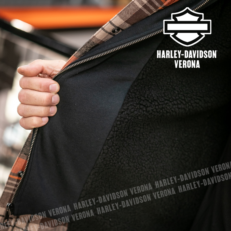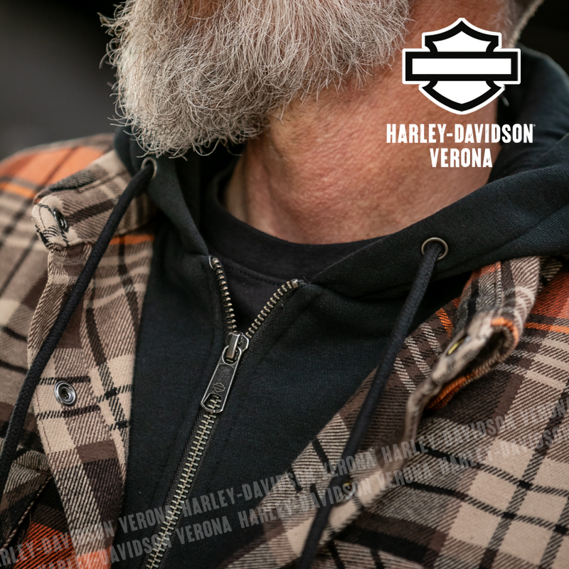 Giacca/camicia Harley-Davidson da uomo con cappuccio in 100% cotone pesante spazzolato twill tinto in capo. Fodera in sherpa 100% poliestere, taffetà di poliestere con imbottitura leggera in poliestere sulle maniche. Chiusura con bottoni automatici sul davanti e sui polsini. Due tasche sul petto con patta e bottoni automatici, tasche scaldamani a filetto con chiusura a scatto nascosta e tasca interna a filetto verticale. Fodera trapuntata a rombi a contrasto, cappuccio foderato in jersey a contrasto con coulisse multidirezionale, collo con bottoni automatici nascosti e spacchetti laterali. Grafica: toppa in jersey stampata con bordo a zigzag, etichetta in tessuto con marchio. Gianni è alto 180 cm e indossa la taglia M.