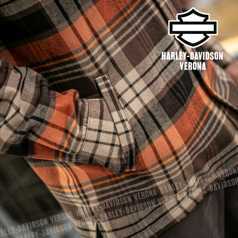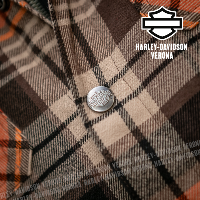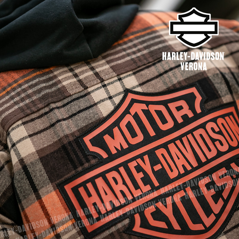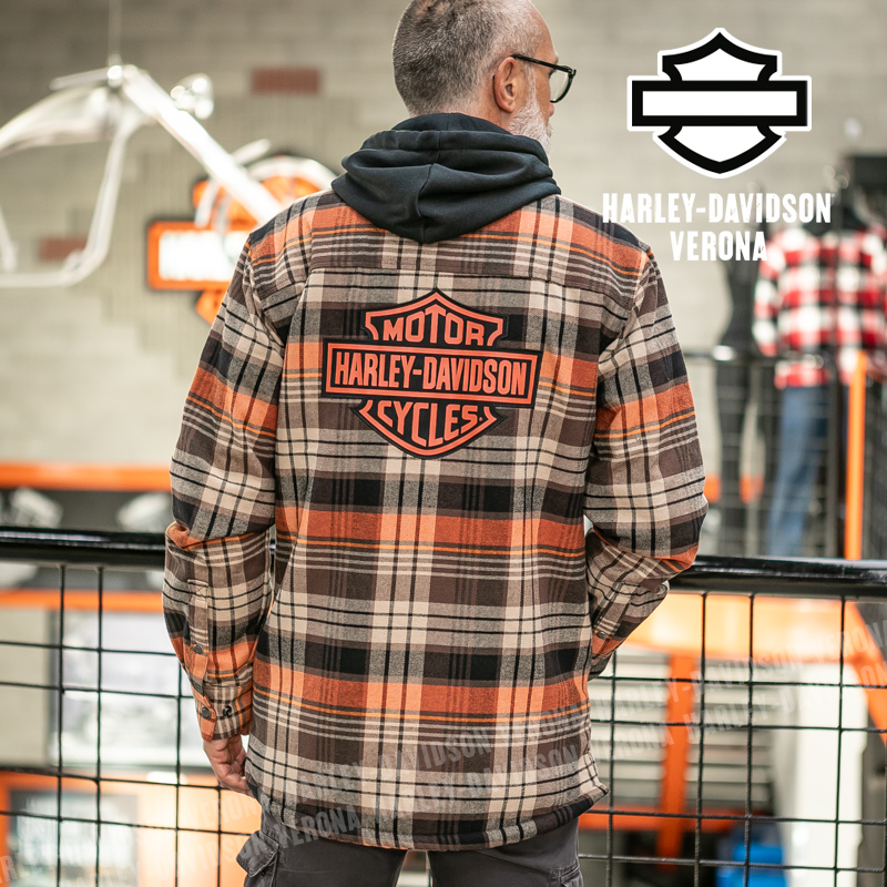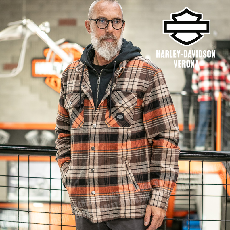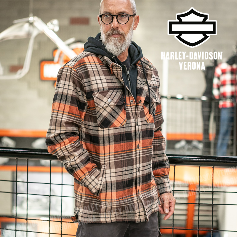 Giacca/camicia Harley-Davidson da uomo con cappuccio in 100% cotone pesante spazzolato twill tinto in capo. Fodera in sherpa 100% poliestere, taffetà di poliestere con imbottitura leggera in poliestere sulle maniche. Chiusura con bottoni automatici sul davanti e sui polsini. Due tasche sul petto con patta e bottoni automatici, tasche scaldamani a filetto con chiusura a scatto nascosta e tasca interna a filetto verticale. Fodera trapuntata a rombi a contrasto, cappuccio foderato in jersey a contrasto con coulisse multidirezionale, collo con bottoni automatici nascosti e spacchetti laterali. Grafica: toppa in jersey stampata con bordo a zigzag, etichetta in tessuto con marchio. Gianni è alto 180 cm e indossa la taglia M.