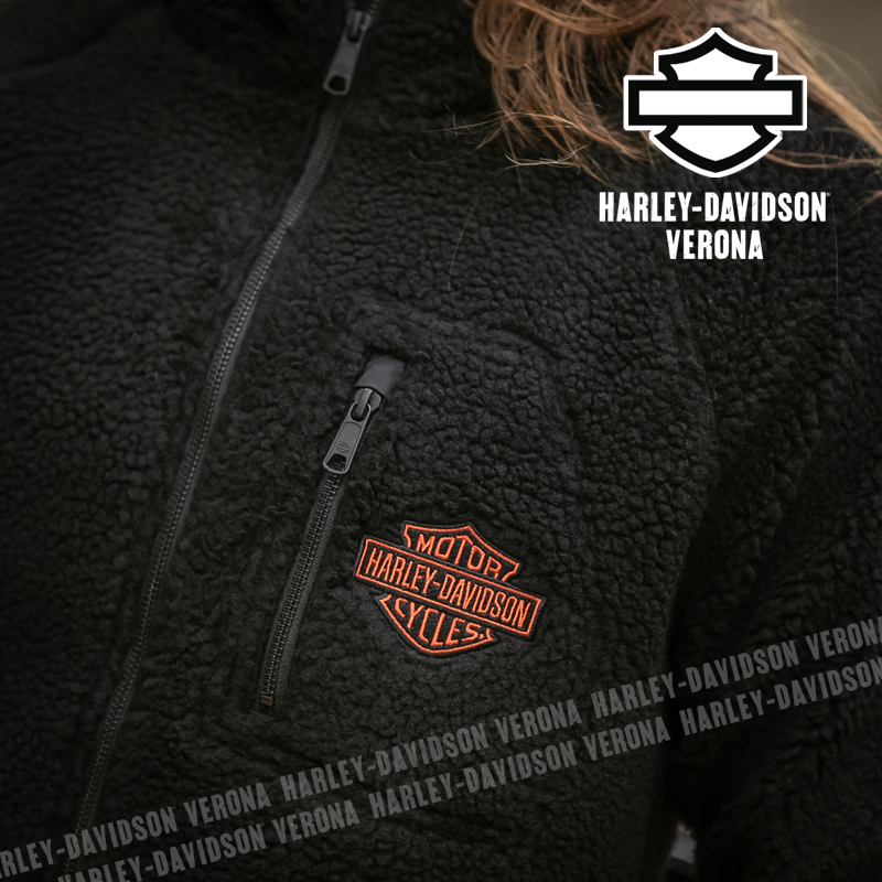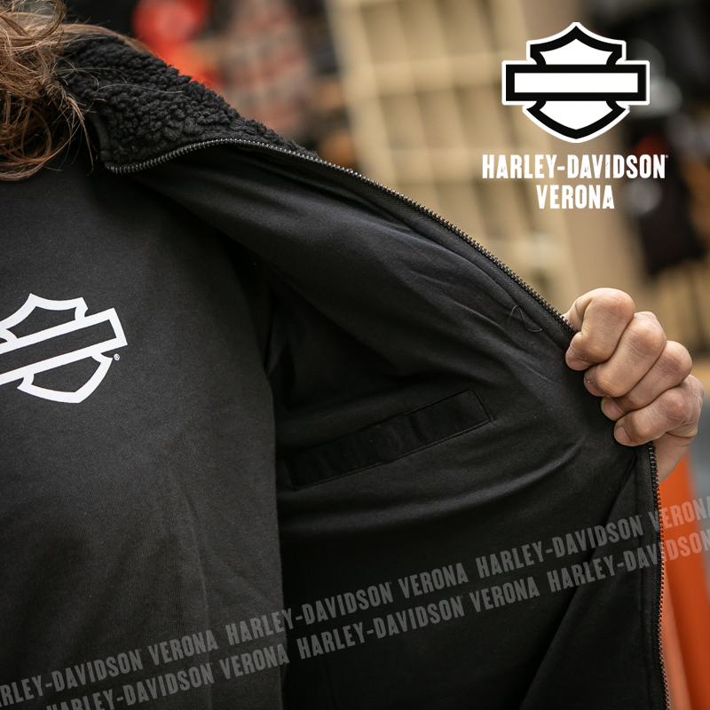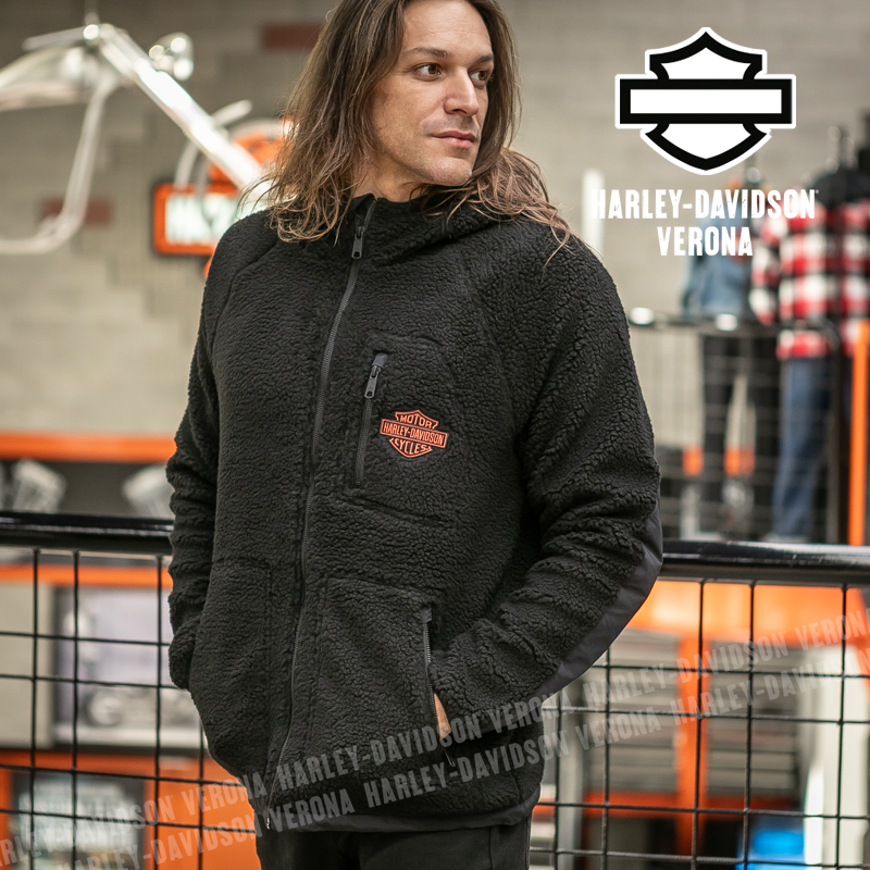 Comodità e fedeltà allo stile motociclistico sono gli elementi vincenti di questa felpa con cerniera! È realizzata in sherpa di poliestere pesante, foderato di taffetà di poliestere con orlo, polsini e bordo del cappuccio elastici per conservare meglio il calore corporeo quando il termometro scende. Questo capospalla da uomo si caratterizza, inoltre, per le ampie tasche e la composizione a contrasto sulle maniche per un look raffinato. Il branding è presente in modo sommesso, con una versione ricamata dello stemma Bar & Shield sul davanti. Timothy è alto 180 cm e indossa la taglia L.