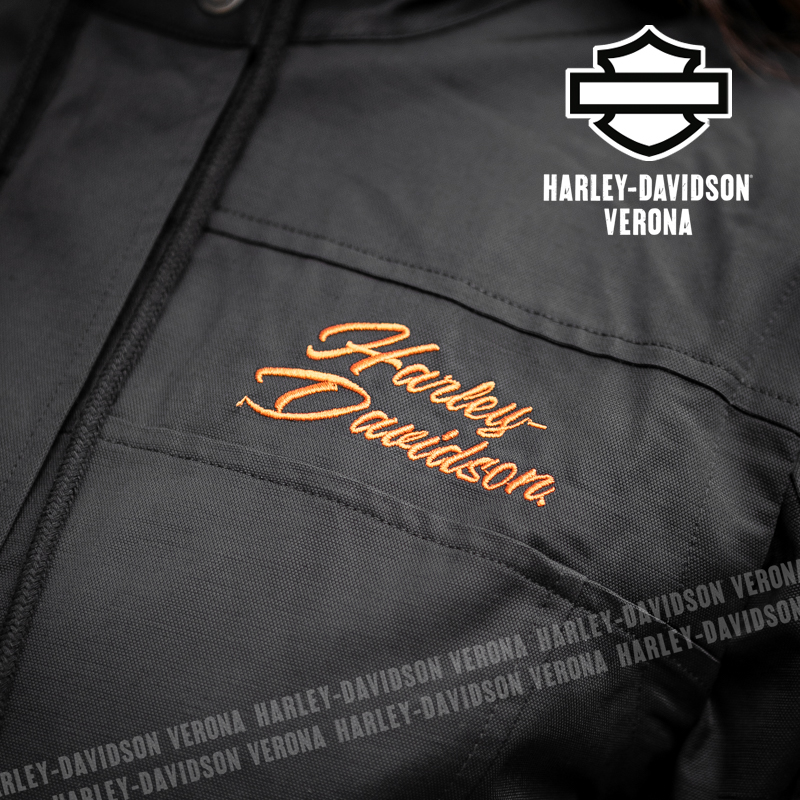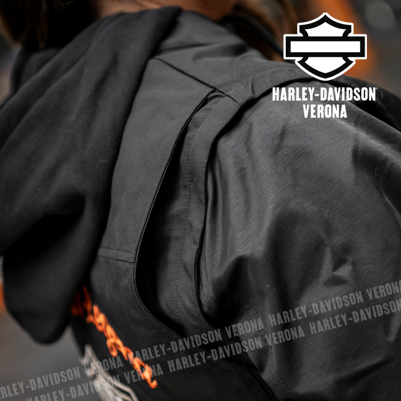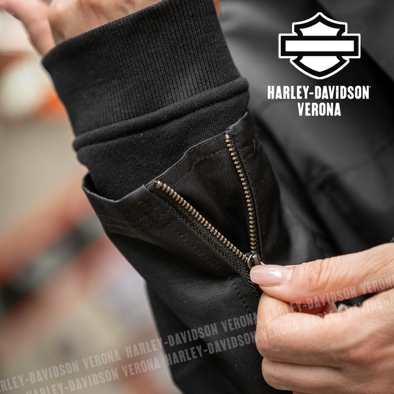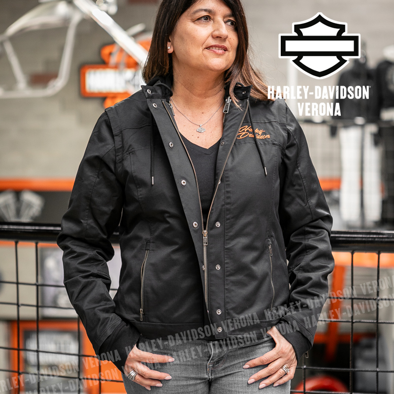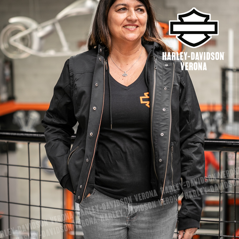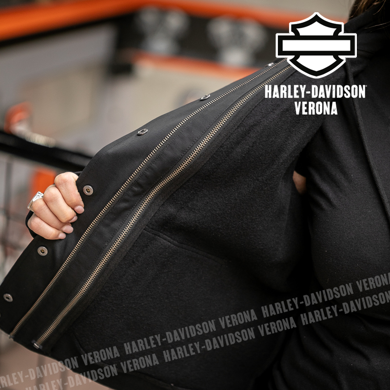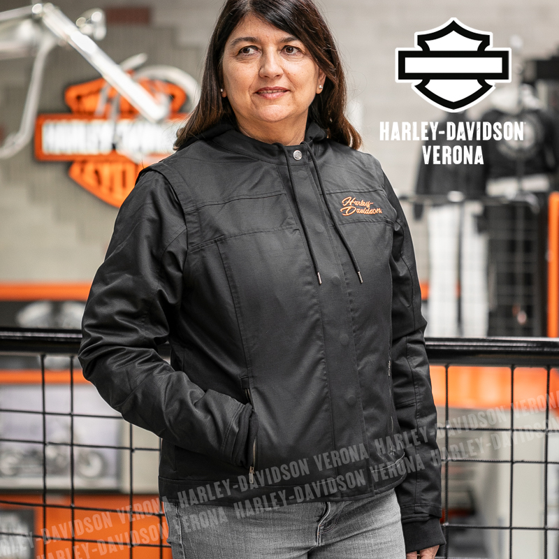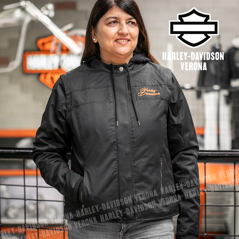 Stile, comfort e versatilità migliorati convergono in questo nuovissimo giubbotto in tessuto Miss Enthusiast 3-in-1! Lo strato esterno del giubbotto è realizzato in tessuto Oxford di cotone/nylon pesante. Le maniche sono rimovibili in modo da poterlo indossare come un gilet ed è inoltre dotato di colletto con linguetta regolabile. Abbiamo anche ammodernato la felpa con cappuccio, dotandola di una cerniera aggiuntiva che si fissa alla giacca o al gilet e di una coulisse che si ripone dentro il cappuccio, in modo da non svolazzare mentre guidi. Puoi indossare solo la giacca, solo il gilet, solo la felpa oppure tutto insieme. In ogni caso, questo capo diventerà qualcosa di irrinunciabile per ogni occasione motociclistica. I capi sfoggiano le classiche grafiche ricamate H-D, per uno stile sempre inimitabile. Acquistala subito prima che le scorte finiscano! Eleonora è alta 172cm e indossa la taglia L.