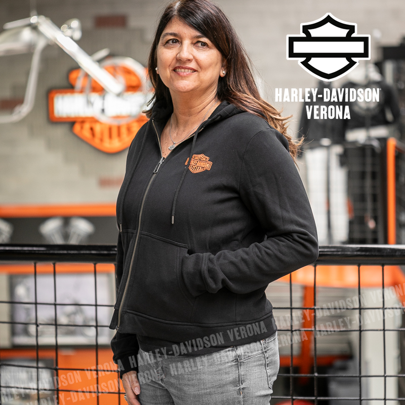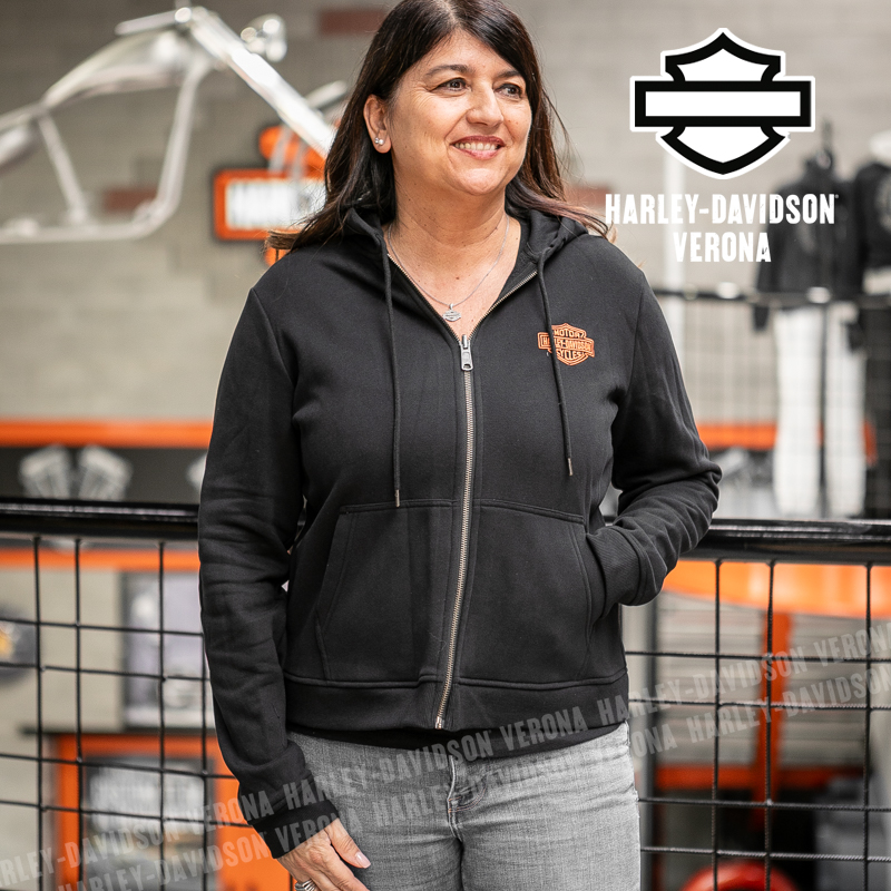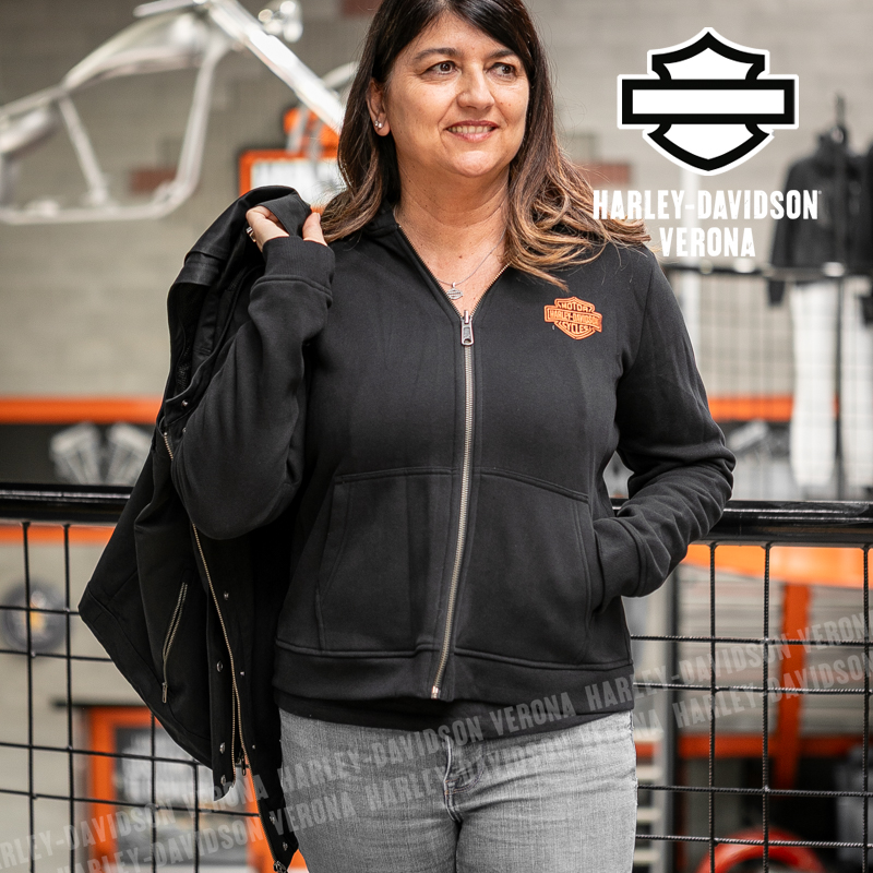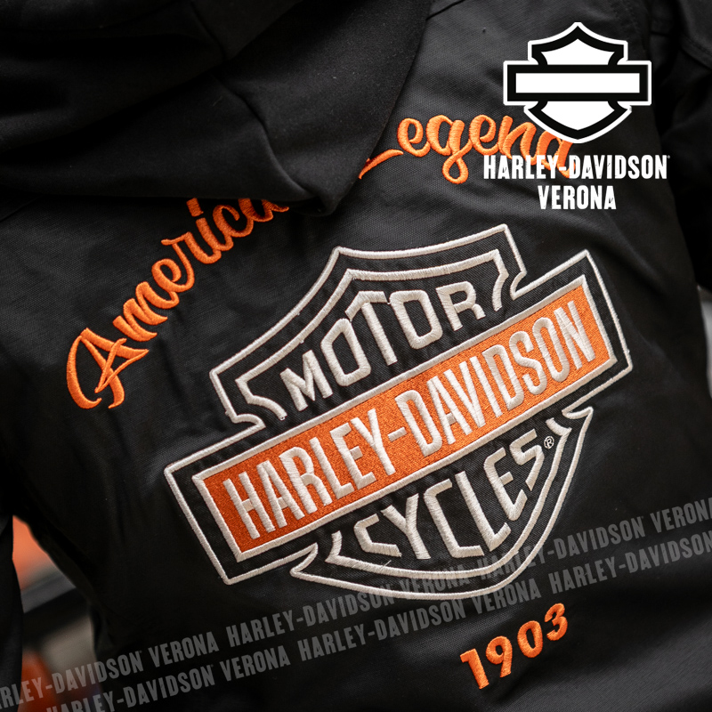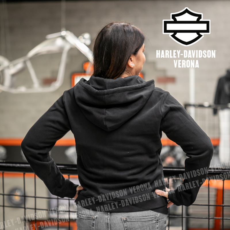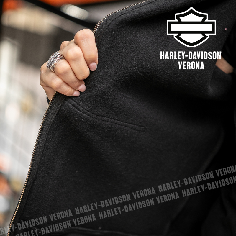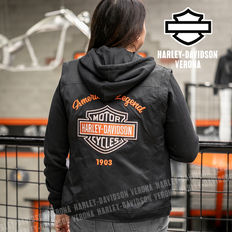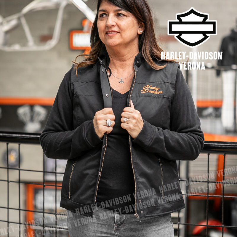 Stile, comfort e versatilità migliorati convergono in questo nuovissimo giubbotto in tessuto Miss Enthusiast 3-in-1! Lo strato esterno del giubbotto è realizzato in tessuto Oxford di cotone/nylon pesante. Le maniche sono rimovibili in modo da poterlo indossare come un gilet ed è inoltre dotato di colletto con linguetta regolabile. Abbiamo anche ammodernato la felpa con cappuccio, dotandola di una cerniera aggiuntiva che si fissa alla giacca o al gilet e di una coulisse che si ripone dentro il cappuccio, in modo da non svolazzare mentre guidi. Puoi indossare solo la giacca, solo il gilet, solo la felpa oppure tutto insieme. In ogni caso, questo capo diventerà qualcosa di irrinunciabile per ogni occasione motociclistica. I capi sfoggiano le classiche grafiche ricamate H-D, per uno stile sempre inimitabile. Acquistala subito prima che le scorte finiscano! Eleonora è alta 172cm e indossa la taglia L.