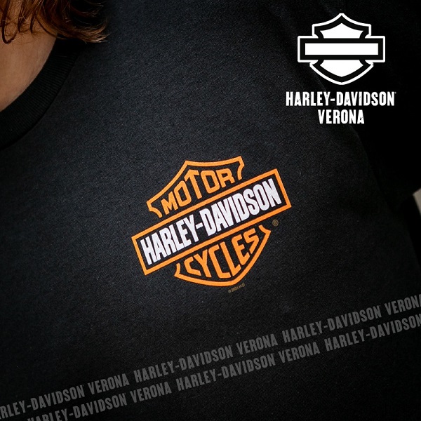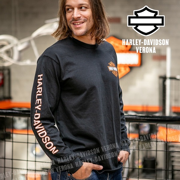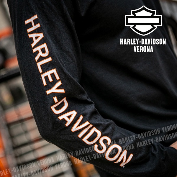 Indossa i colori di H-D® Verona! Nuovissima collezione di maglie a manica lunga, in nero con grafica del nostro iconico B&S in arancione e scritta lungo la manica, perfetta per mostrare la tua appartenenza alla famiglia Harley-Davidson Verona o per un ricordo unico della tua visita alla città di Romeo e Giulietta! Timothy è alto 180 cm e indossa la taglia L.