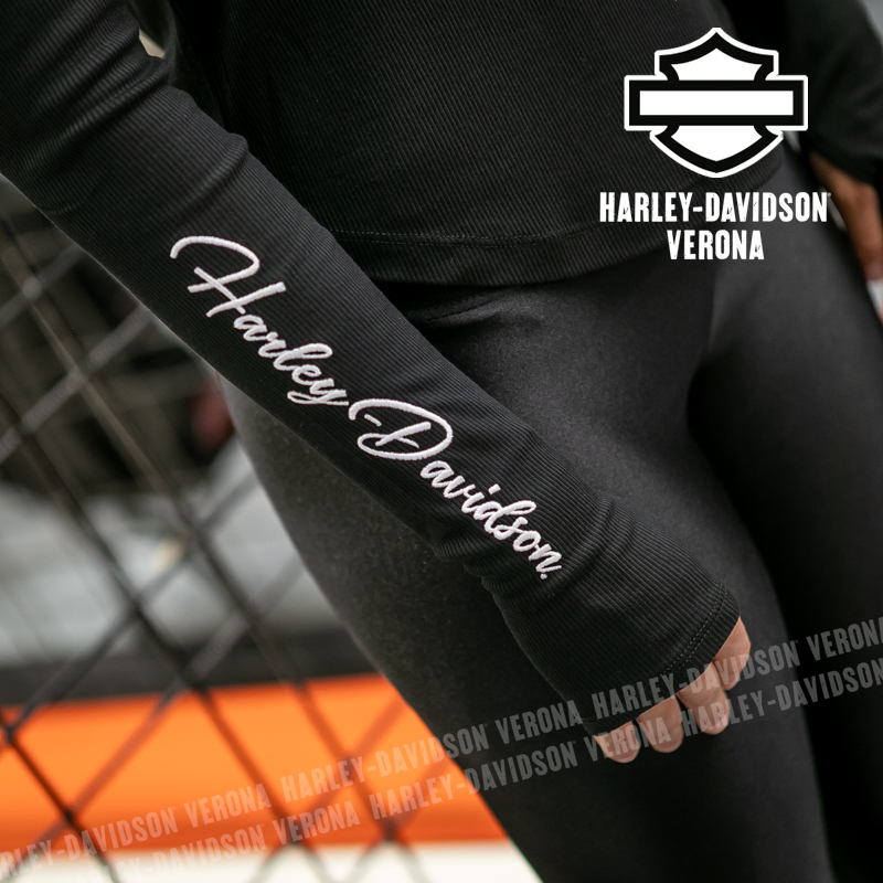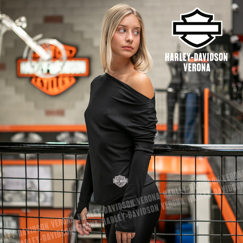 Quando inizia la stagione fresca, noi ragazze non rinunciamo allo stile! Questa morbida maglia a maniche lunghe, realizzata in maglina misto Modal 68%, poliestere 27% e Spandex 5% in elegantissimo colore nero, ha un largo scollo alla Carmen, il nostro amato logo ricamato in basso a sinistra e la scritta Harley-Davidson ricamata sulla manica destra. Un capo essenziale e raffinato, da portare sotto la giacca da moto o da abbinare ai tuoi jeans preferiti, immancabile nel tuo guardaroba autunnale!