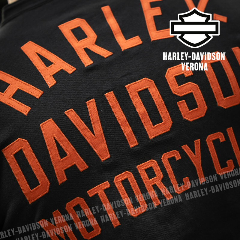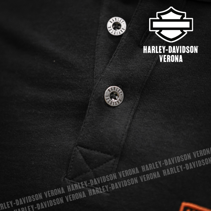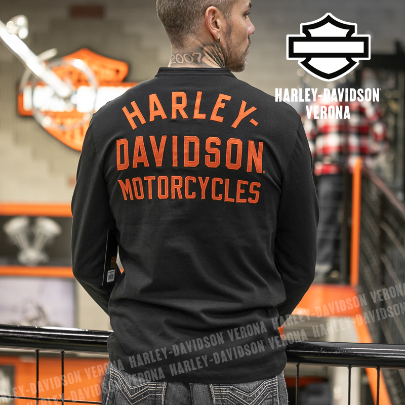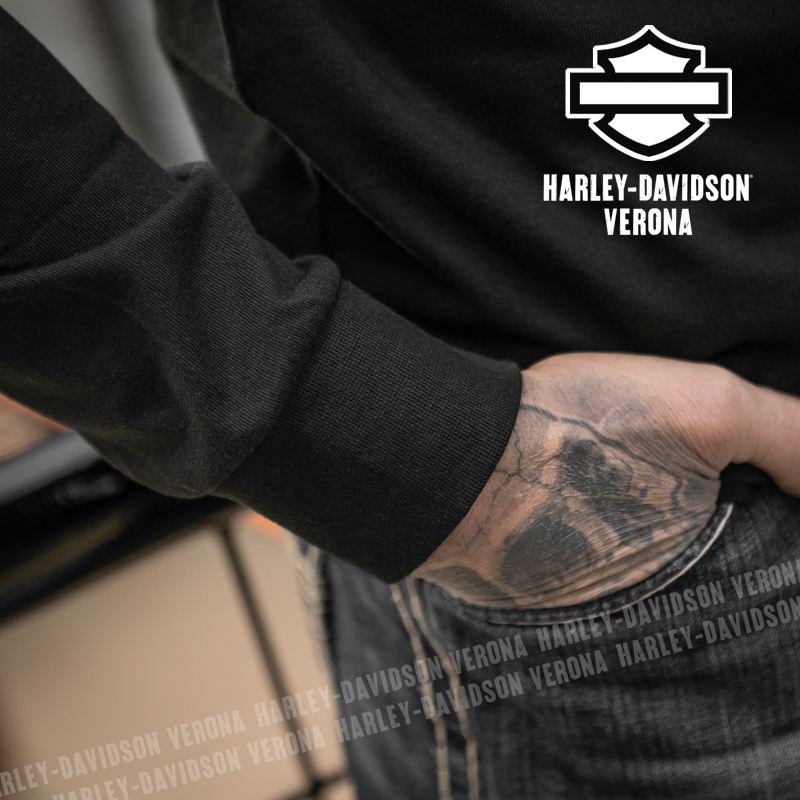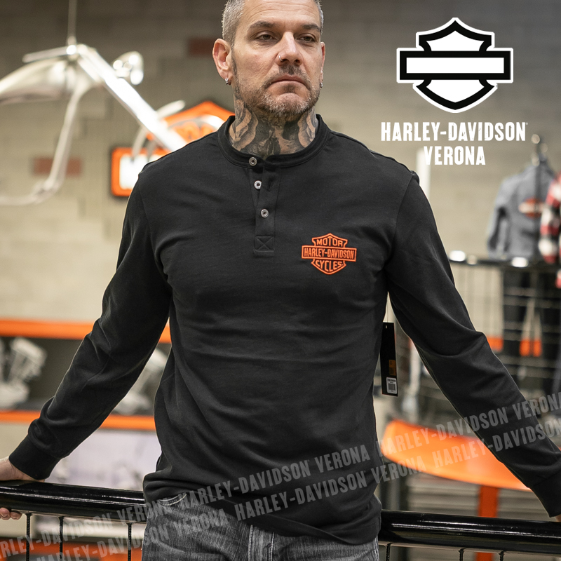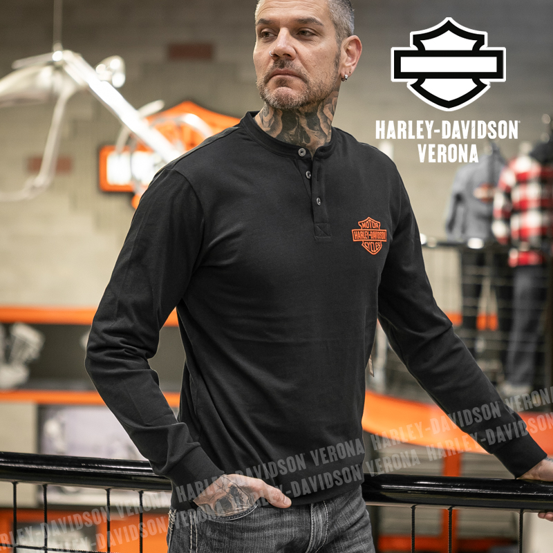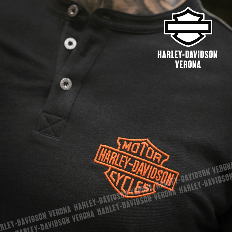 Questo modello casual, uno dei preferiti dai nostri biker, celebra la nostra tradizione nelle gare flat-track. Realizzata in jersey di cotone pesante, è stata sottoposta a lavaggio ammorbidente. Classica abbottonatura a tre bottoni in stile serafino e polsini in maglia a costine. Lo stemma Bar & Shield è ricamato sul davanti, mentre sulla schiena campeggia un appliqué che richiama le nostre maglie da corsa degli anni d’oro. Sebastiano è alto 190 cm e indossa la taglia M.