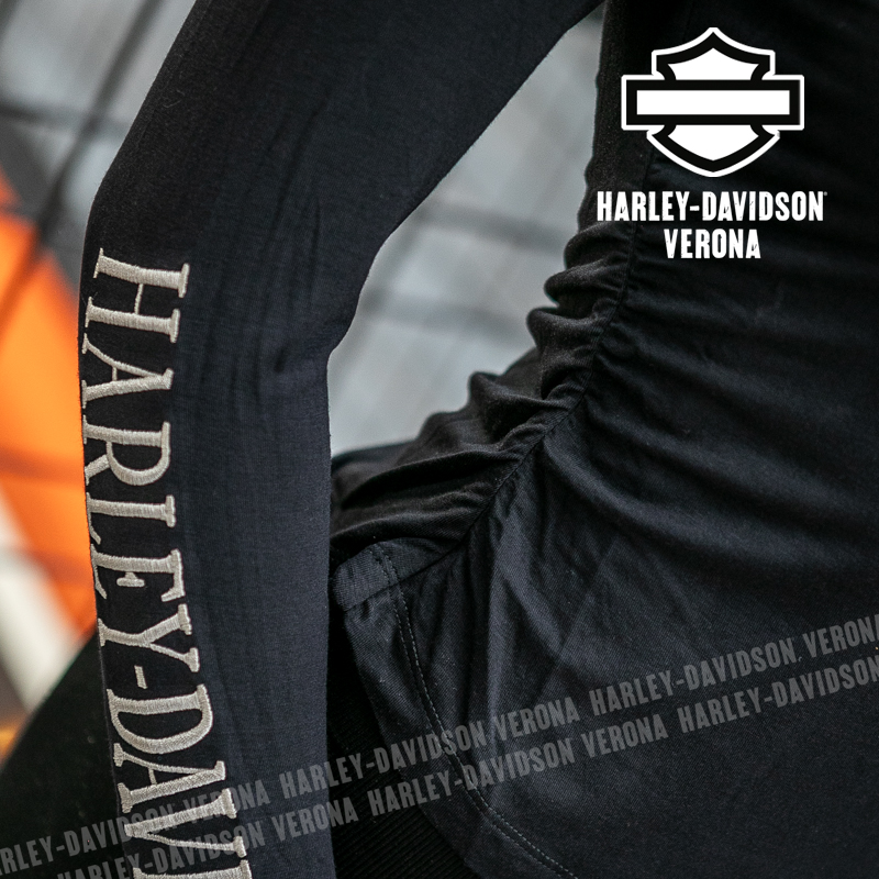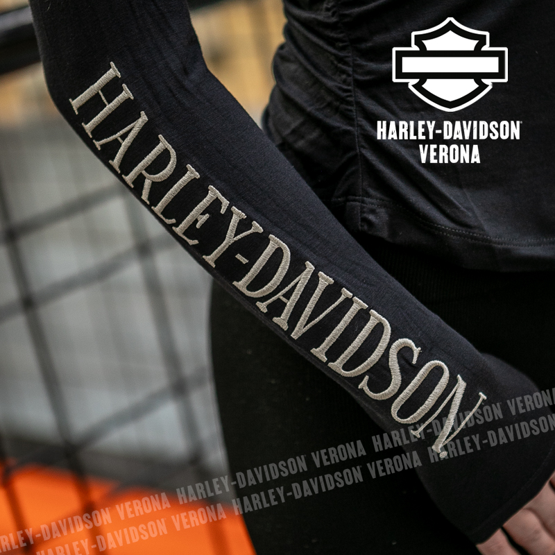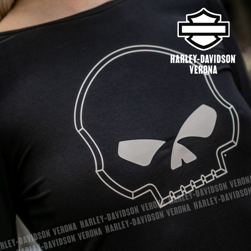 Valorizza le tue forme e sfoggia uno stile da vera appassionata con il top a maniche lunghe Willie G™ Skull. Il top è fabbricato in maglia rayon/spandex per una sensazione morbida ed elastica sulla pelle. Non ti stancherai mai di indossarlo. Questa maglia a maniche lunghe dalla vestibilità attillata presenta ruches laterali e orlo a falda. La grafica che domina sul davanti e che sale lungo la manica gli conferisce un look distintivo che onora l’eredità creativa di Willie G. Davidson.