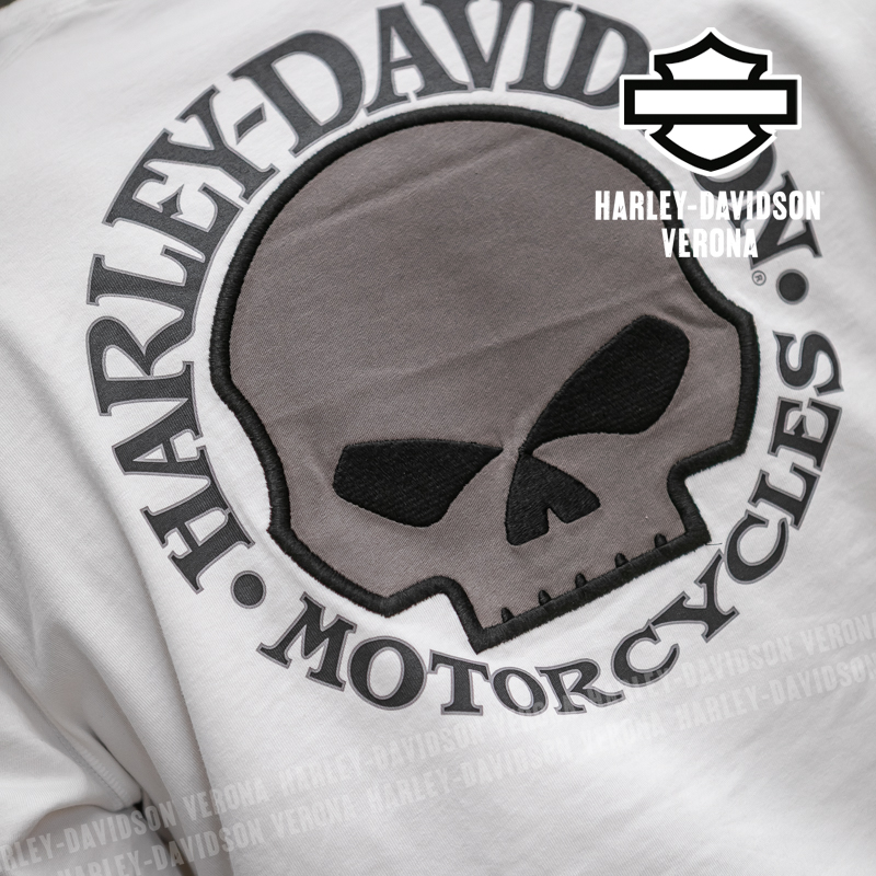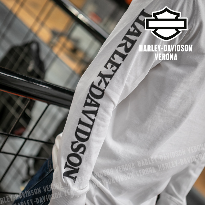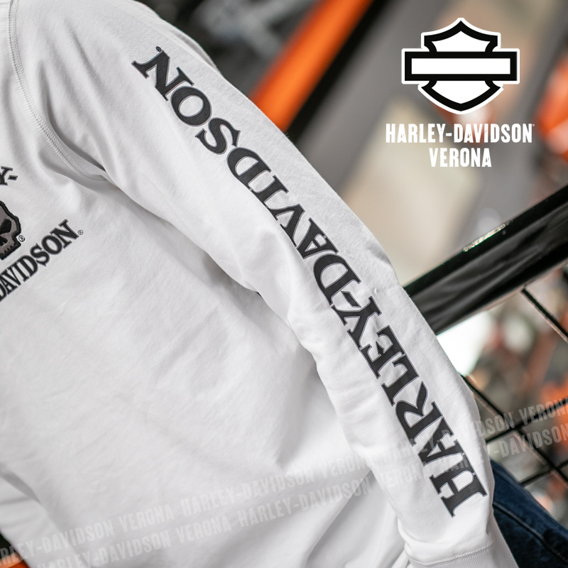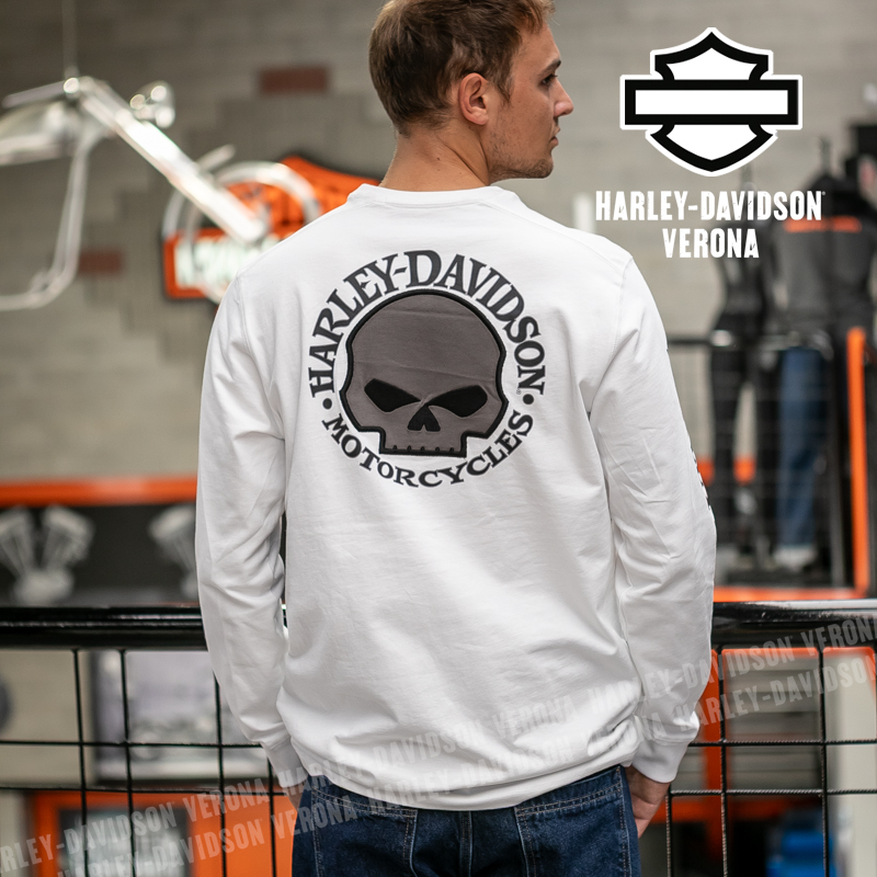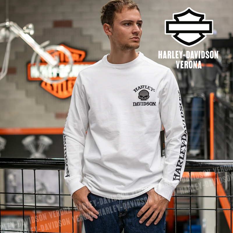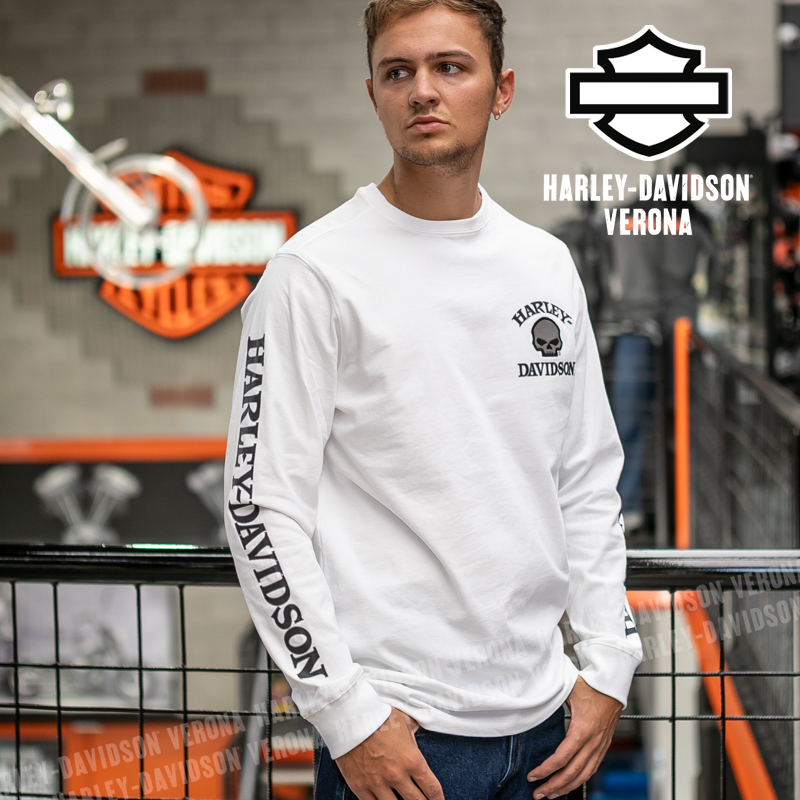 Fatti notare, con questa maglia a maniche lunghe in raffinato bianco, realizzata in jersey di cotone 100% con l’iconico teschio di Willie G in appliqué sulla schiena e sul cuore e grafiche stampate lungo le maniche. Il collo e i polsi sono finiti in maglia a costine, per darti il miglior comfort e tenuta durante la guida e giù dalla moto. Leonardo è alto 183 cm e indossa la taglia M.
