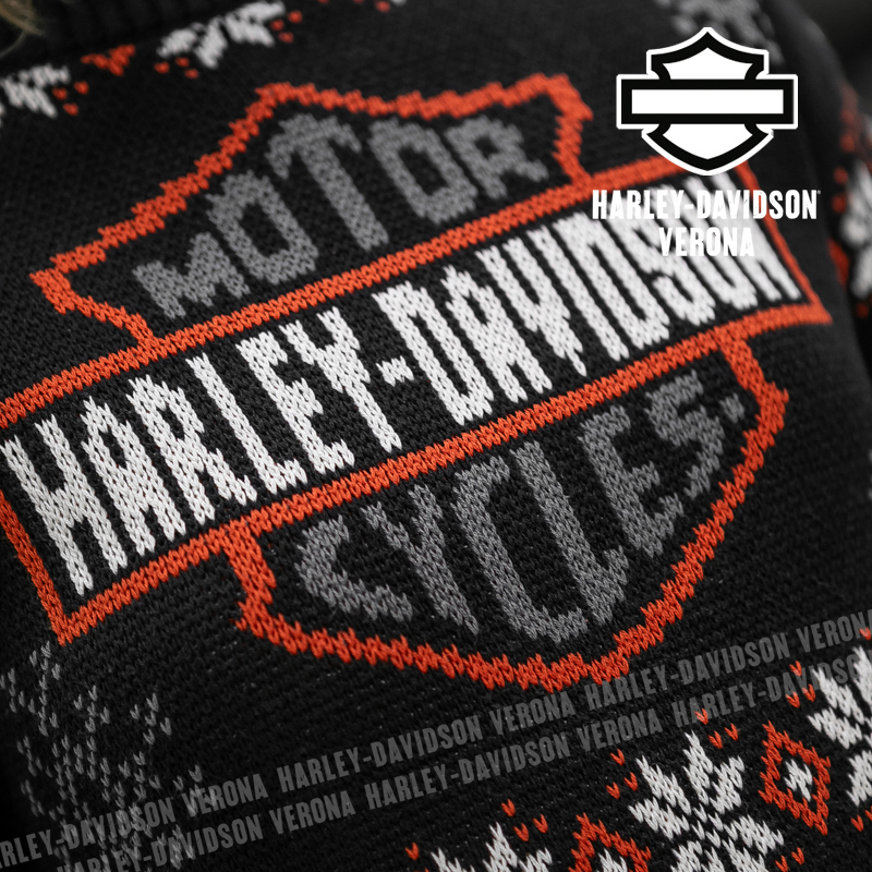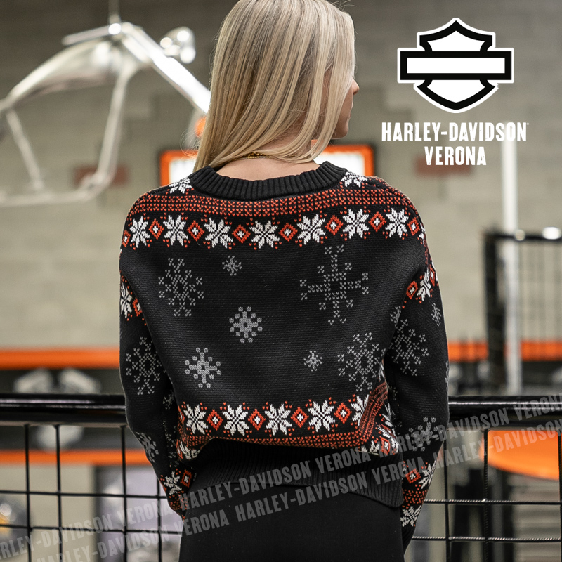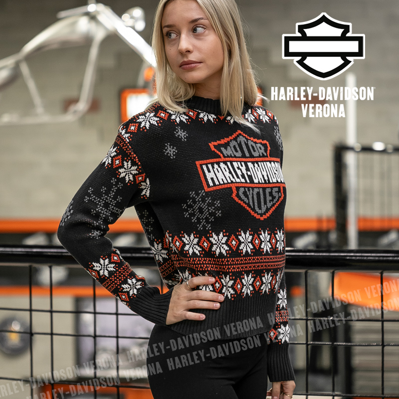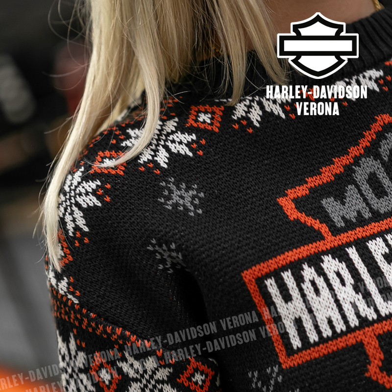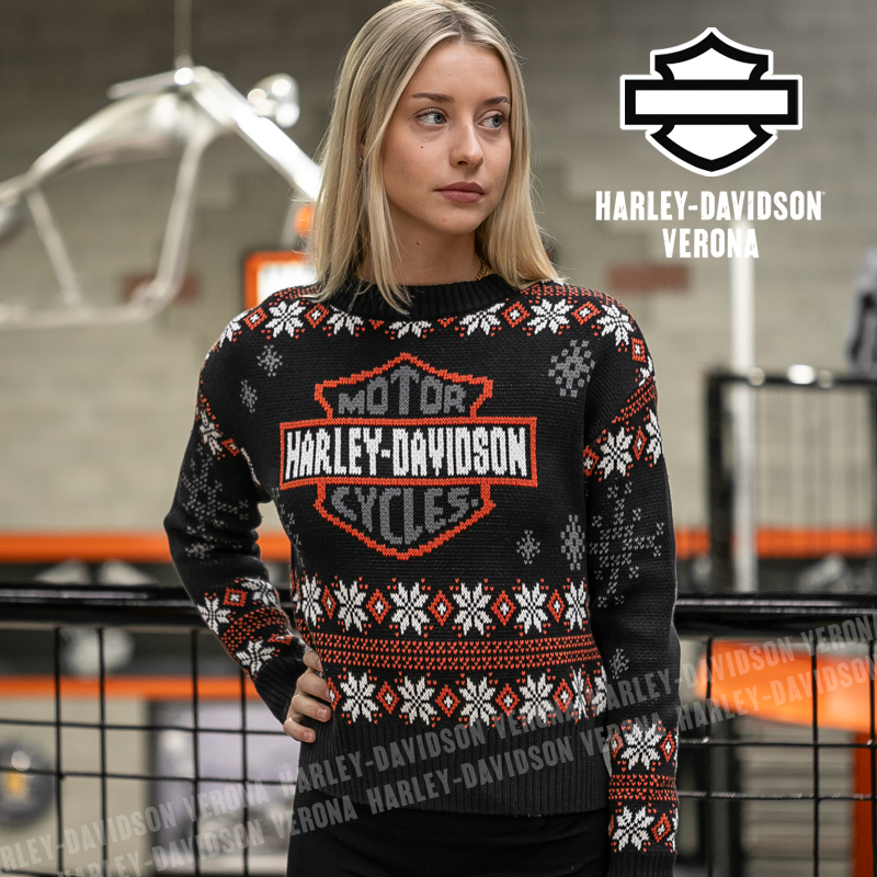 La tua passione non si attenua nemmeno sotto le feste? Allora, questo è il regalo giusto per te! Il maglione natalizio Harley-Davidson è realizzato in morbido filato di cotone 100% di peso medio. Ha scollo, polsini e orlo a coste e grafica personalizzata all-over in maglia a intarsio. Pamela è alta 167 cm e indossa la taglia XS.