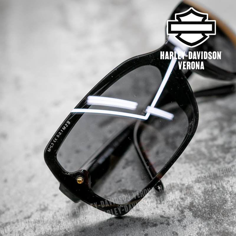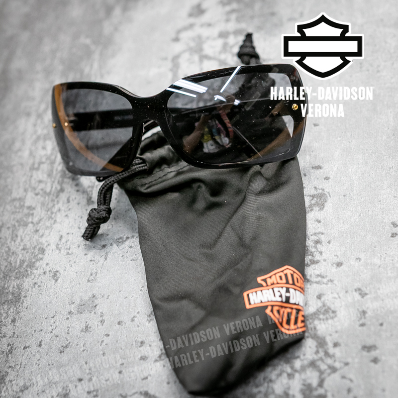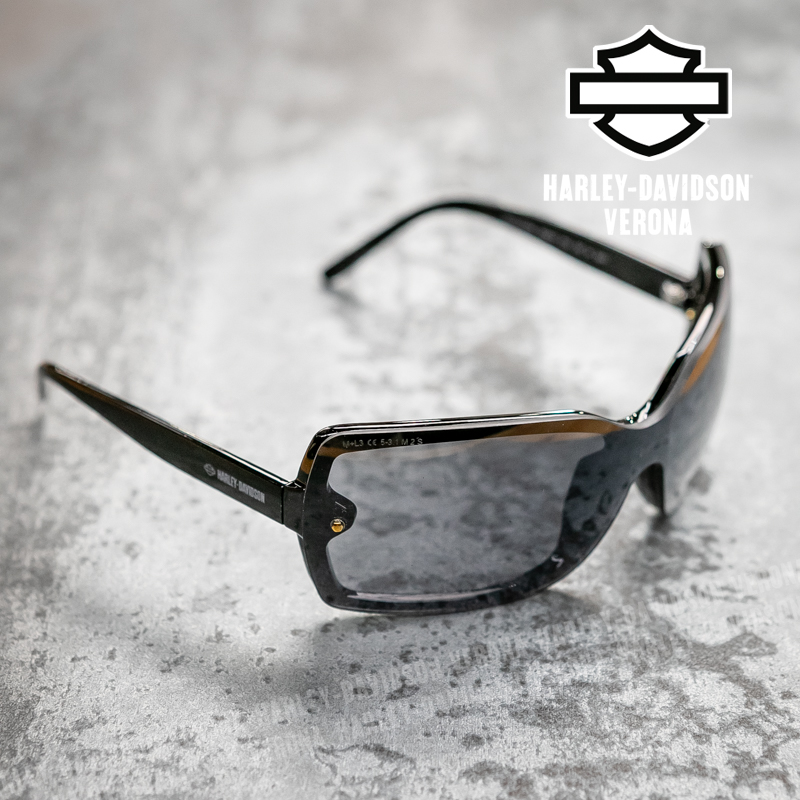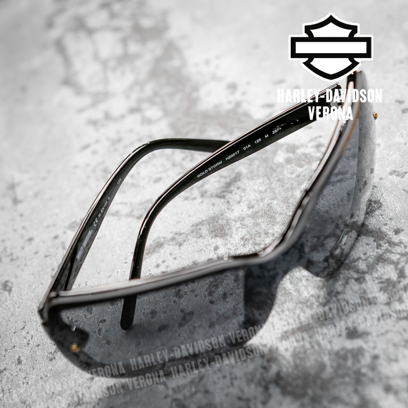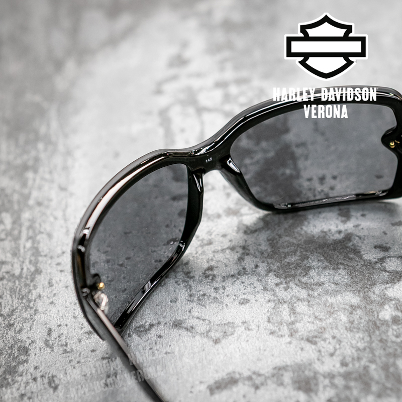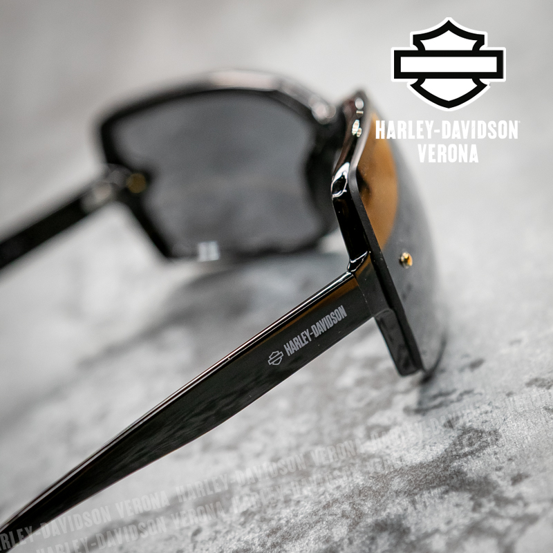 Occhiali da sole Harley-Davidson® in policarbonato nero lucido, aste piatte, lenti con protezione UVA & UVB 100%.
