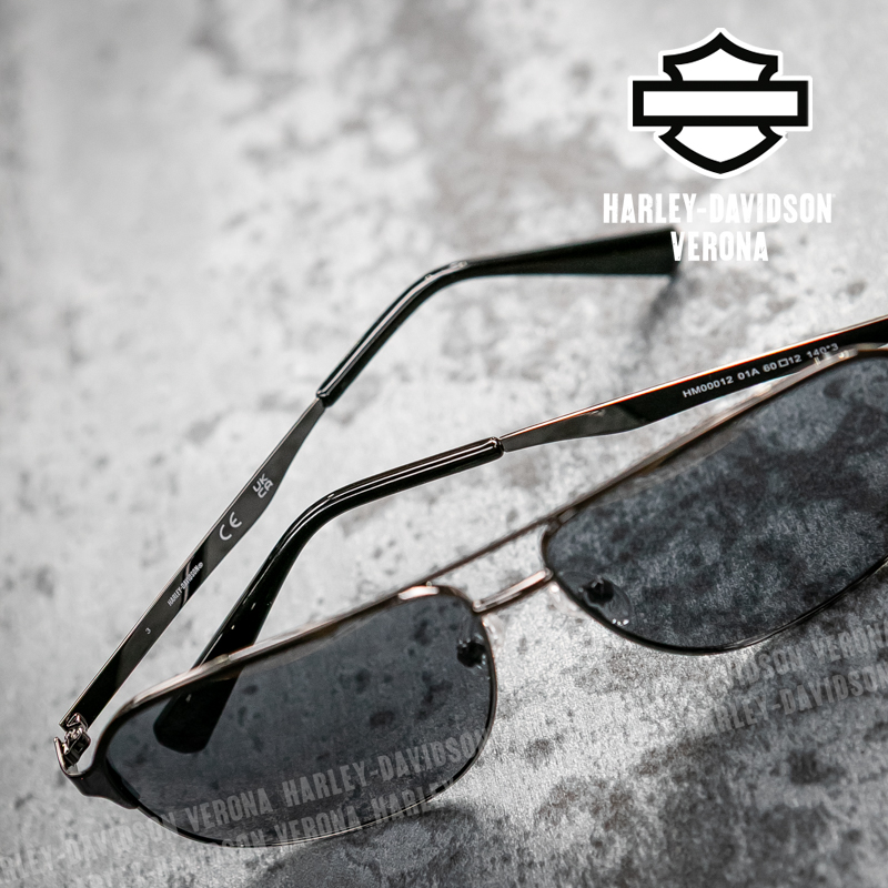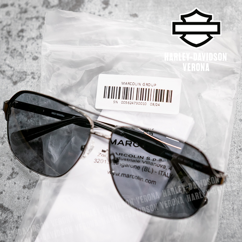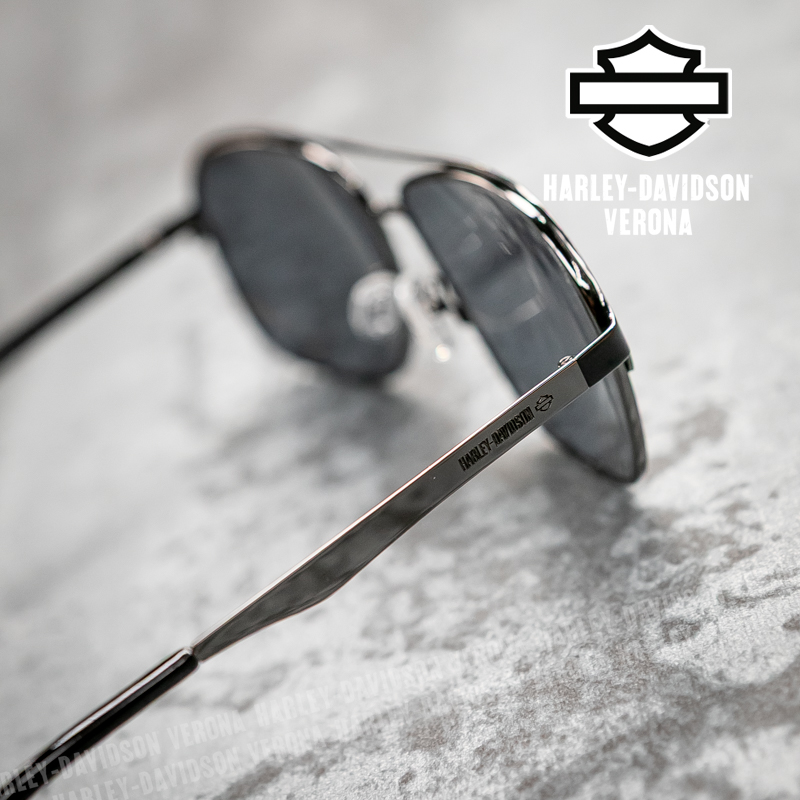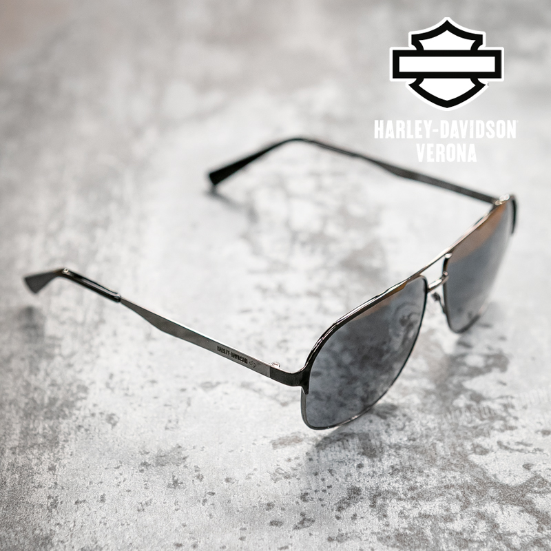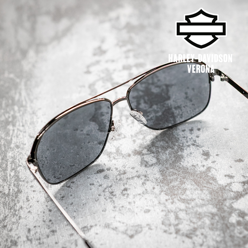 Occhiali da sole in metallo Harley-Davidson® by Marcolin, dalla classica forma aviatore squadrata, aste sottili ed eleganti, finitura lucida, lenti scure, protezione UVA & UVB 100%. Troverai funzionalità, stile e qualità con gli occhiali Harley-Davidson® by Marcolin!