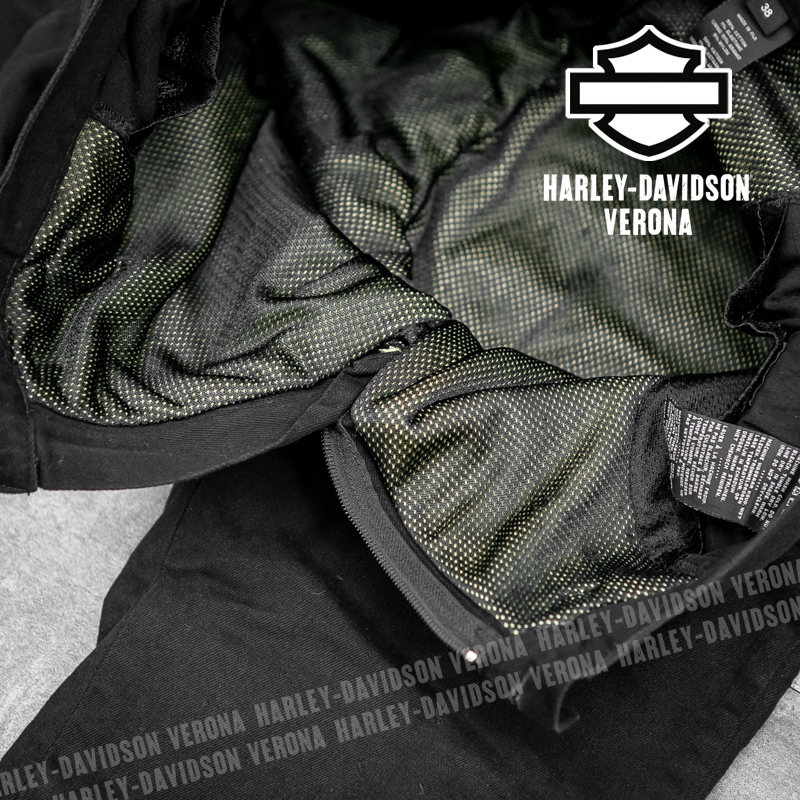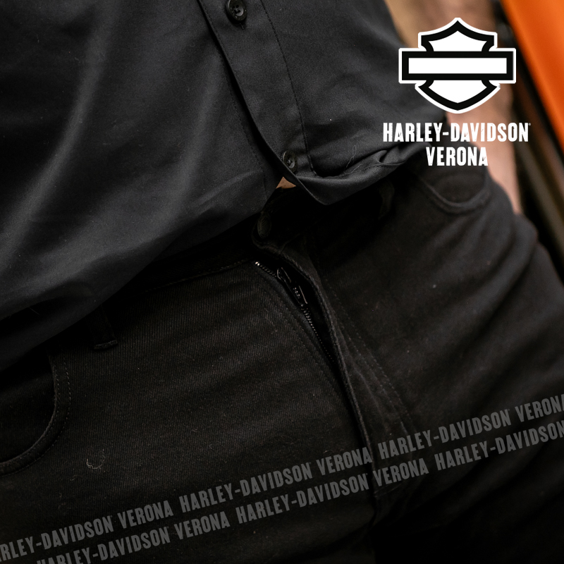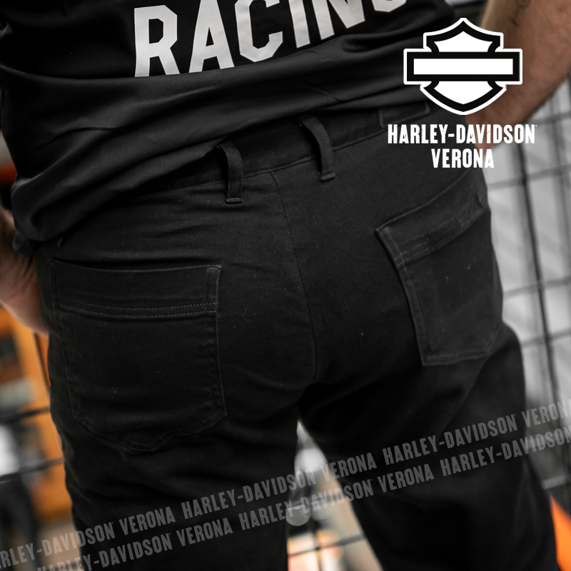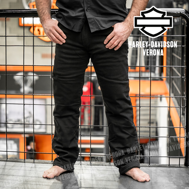 Pantaloni da Uomo Denim Harley-Davidson® Riding FXRG realizzato grazie alla combinazione di resistenti tessuti, quali: 98% cotone, 2% elastan per un peso complessivo di 349 grammi. Un capo completamente foderato, con rifiniture di precisione. Classico stile jeans a cinque tasche approvato CE, fodera protettiva dalla vita alla caviglia, tasca portamonete sul lato sinistro unica per la praticità del pilota. Un pantalone tecnico dalle prestazioni uniche nel suo genere che ti regalerà un comfort ineguagliabile! Scegli di sentirti sempre comodo e ben equipaggiato: scegli Harley-Davidson® e sfreccia con stile.