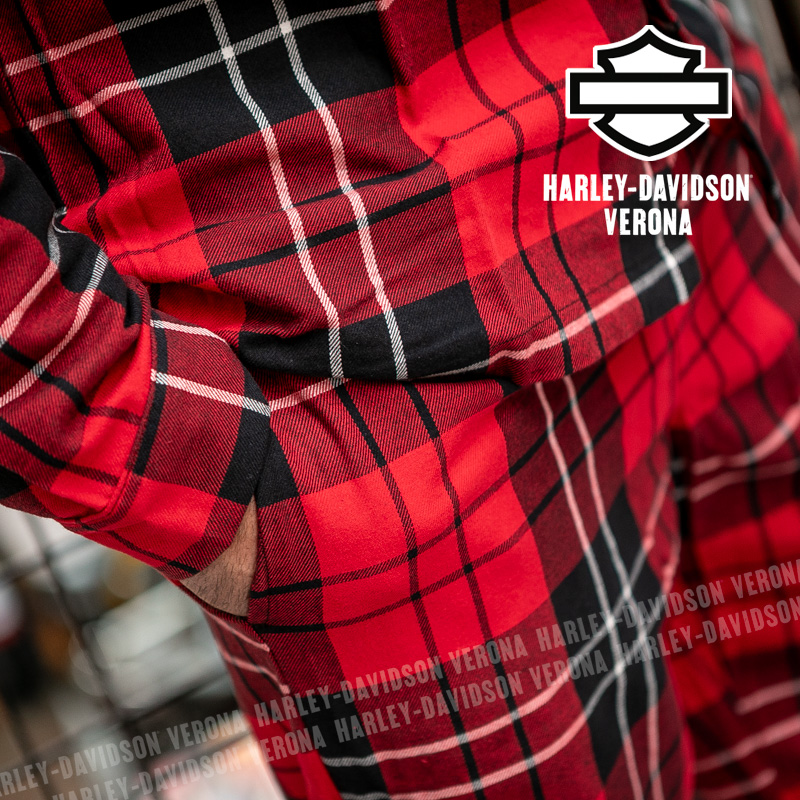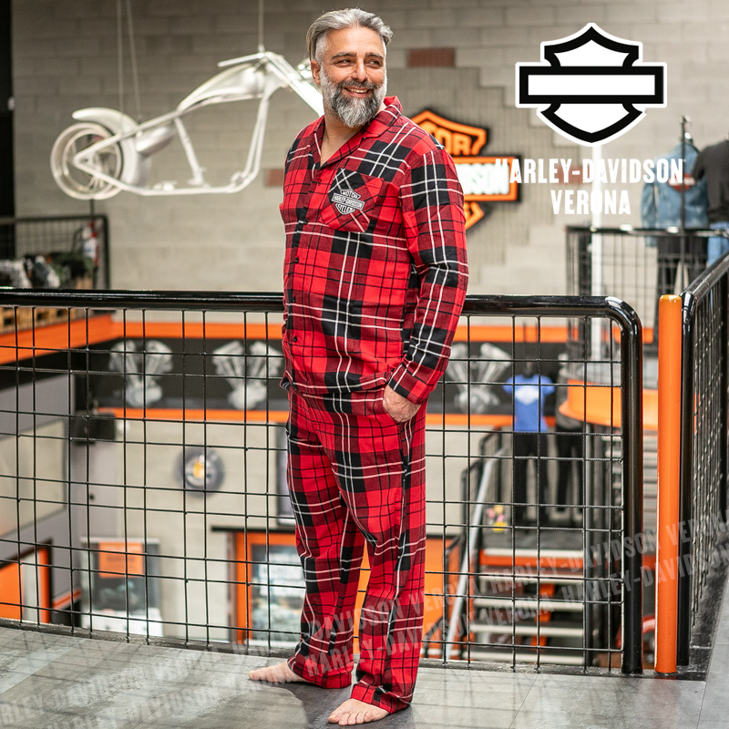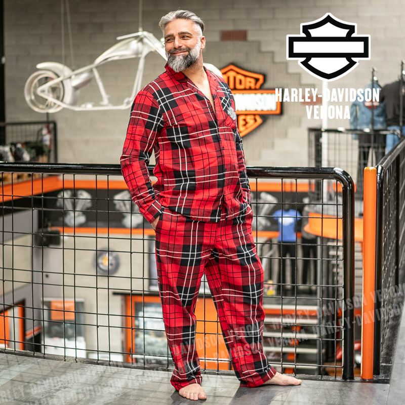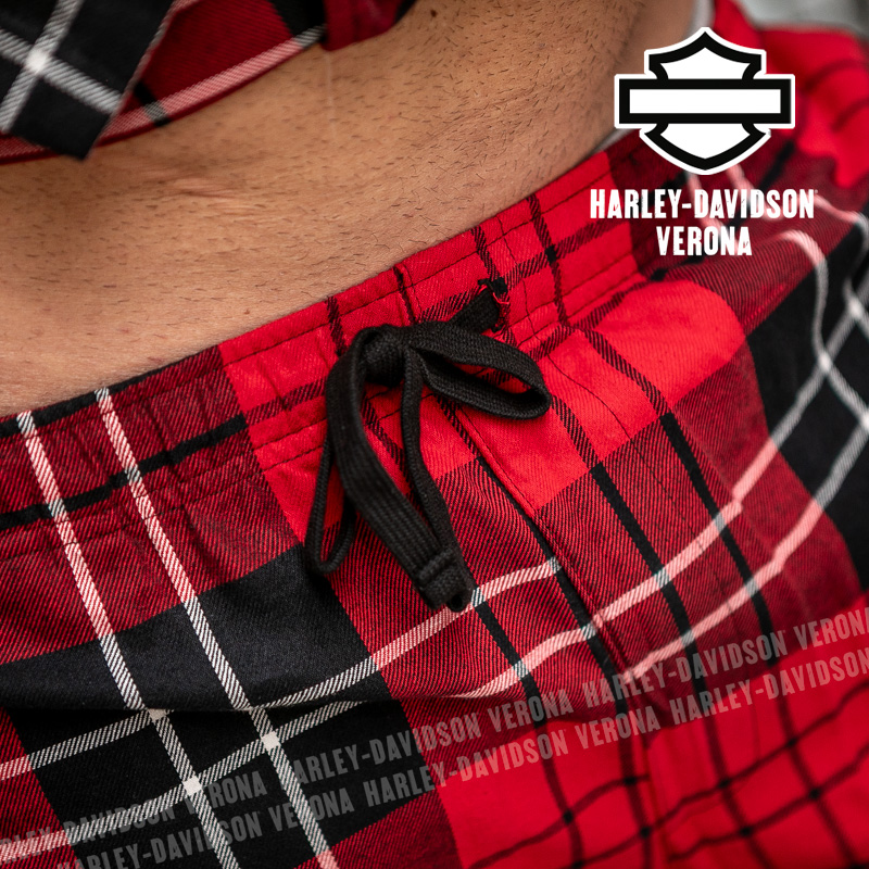 Questo splendido pigiama è il non plus ultra in fatto di comodità! Realizzato in morbida flanella di puro cotone, è perfetto nei giorni in cui vestirsi è facoltativo. La blusa a maniche lunghe è abbottonata sul davanti, ha il colletto ad ampi revers e una tasca applicata, mentre i pantaloni hanno l’elastico in vita e una comoda coulisse. Il motivo a scacchi è lo sfondo ideale per il ricamo del leggendario stemma Bar & Shield. Luca è alto 177 cm e indossa la taglia L.