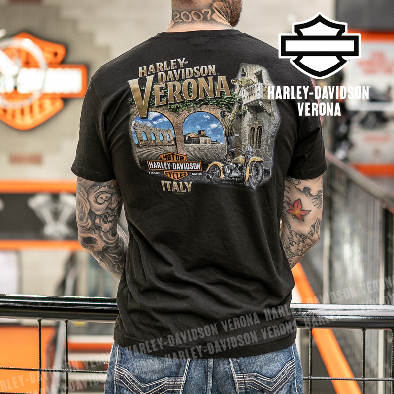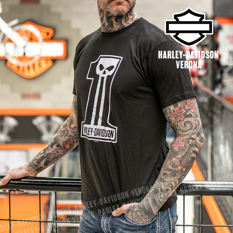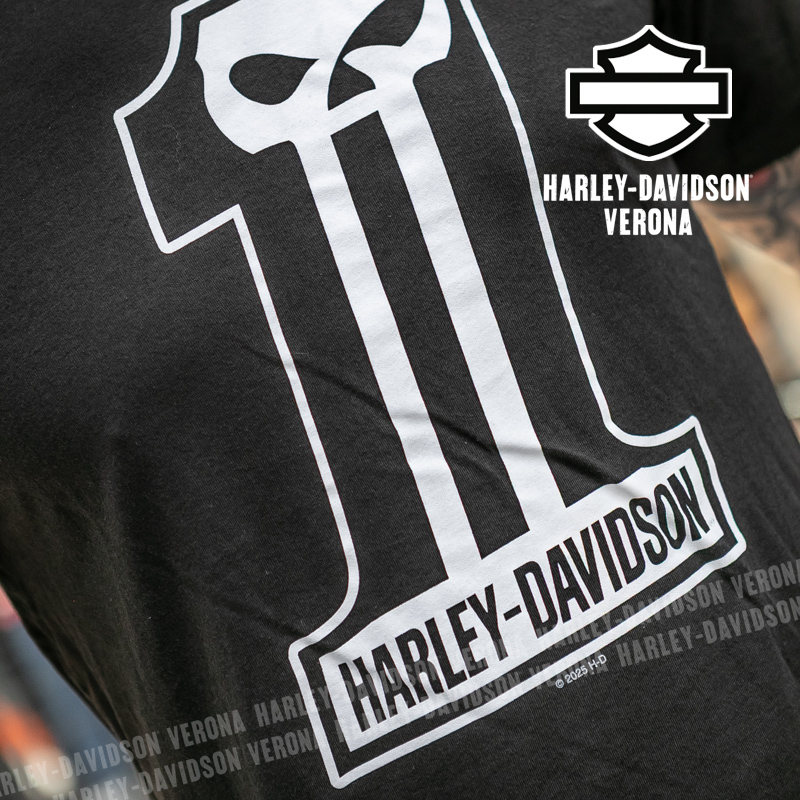 Indossa i colori di H-D® Romeo&Giulietta! Nuovissima collezione di t-shirt in nero con teschio e numero 1 in bianco, perfette per mostrare la tua appartenenza alla famiglia Harley-Davidson Verona o per un ricordo unico della tua visita alla città di Romeo e Giulietta! Sebastiano è alto 190cm e indossa la taglia L.