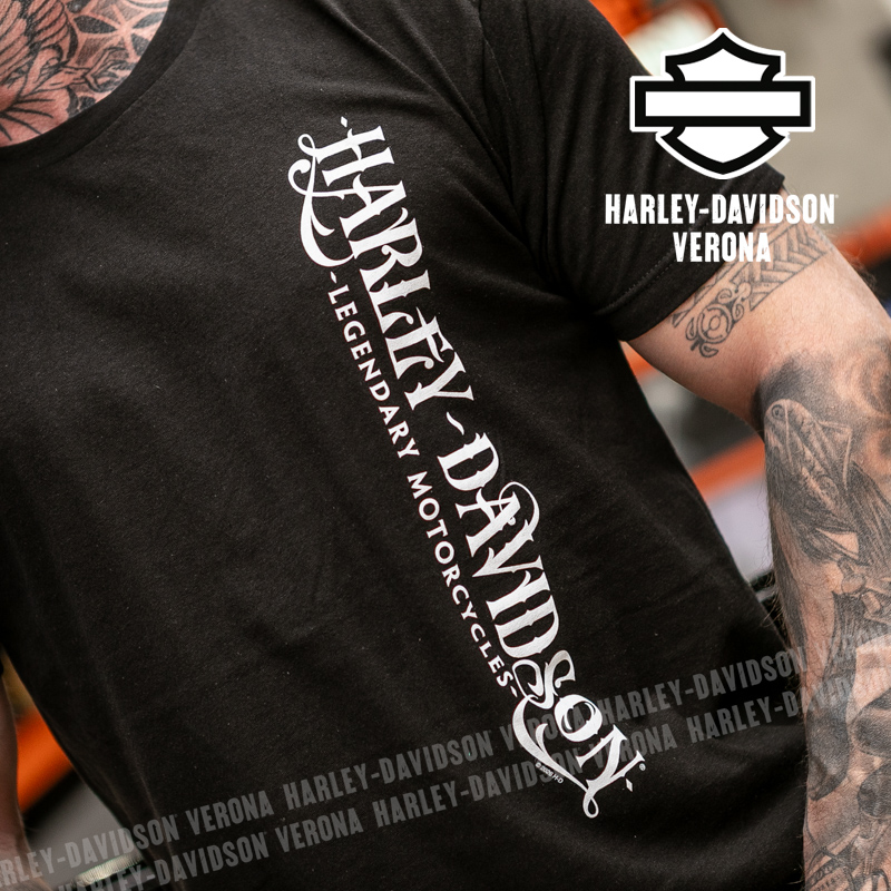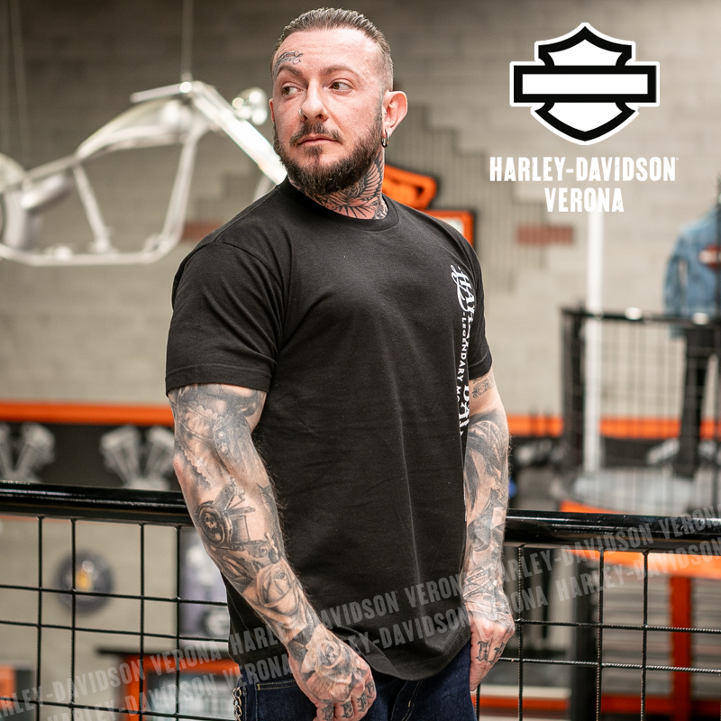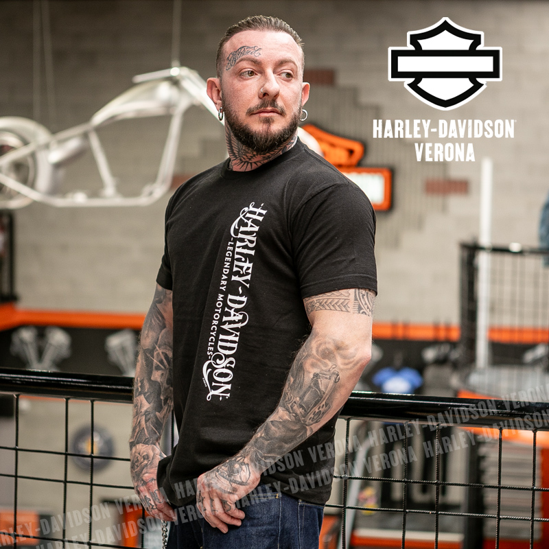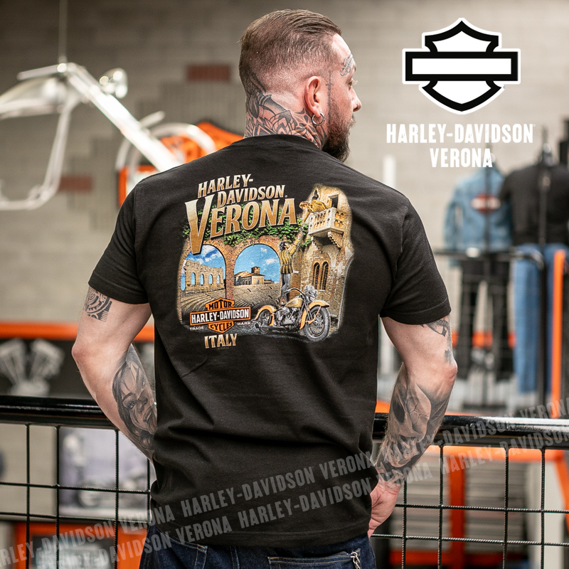 Indossa i colori di H-D® Romeo&Giulietta! Nuovissima collezione 2026 di t-shirt in total black con grafica bianca in verticale, perfette per mostrare la tua appartenenza alla famiglia Harley-Davidson Verona o per un ricordo unico della tua visita alla città di Romeo e Giulietta! Davide è alto 180 cm e indossa la taglia L.