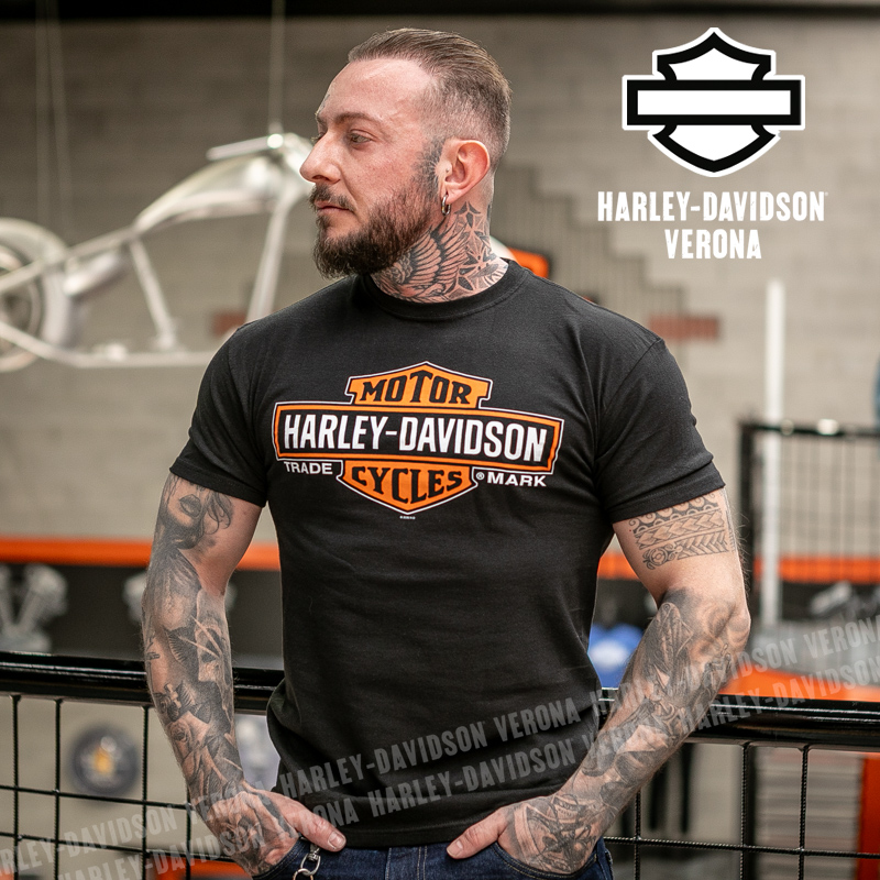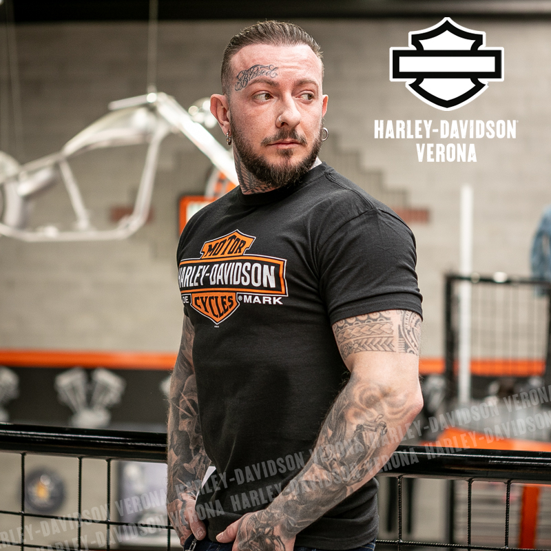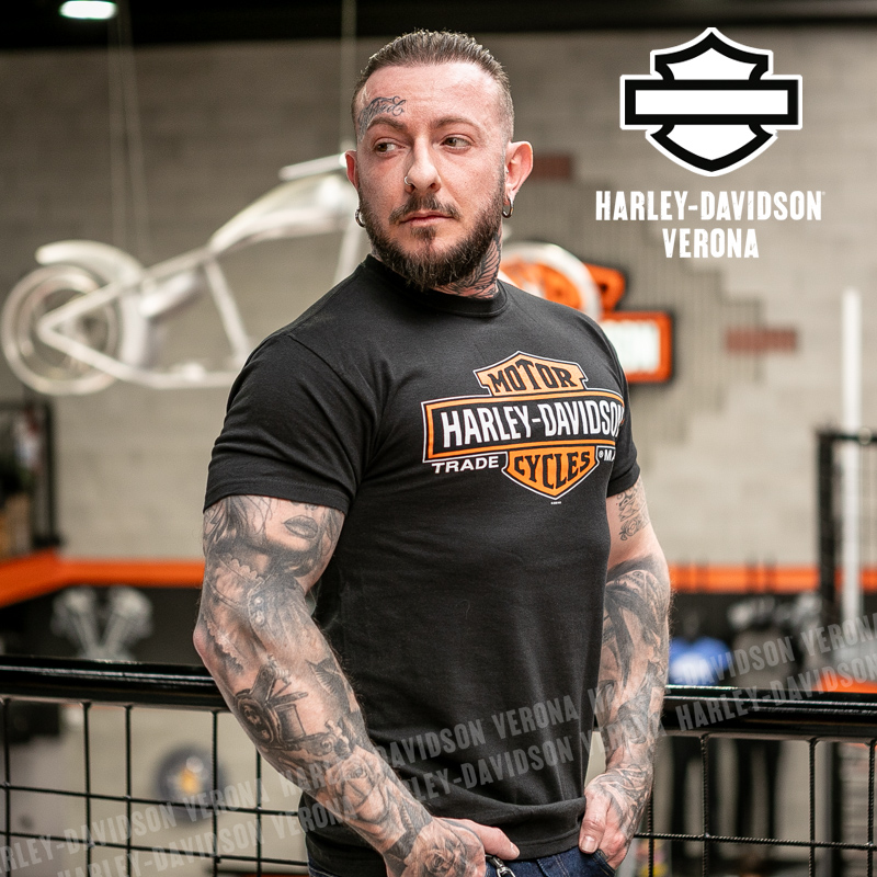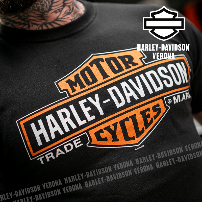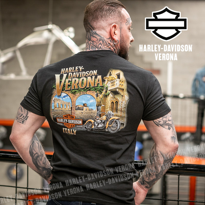 Indossa i colori di H-D® Romeo&Giulietta! Nuovissima collezione 2026 di t-shirt in total black con classico Bar & Shield nella sua versione allungata, perfette per mostrare la tua appartenenza alla famiglia Harley-Davidson Verona o per un ricordo unico della tua visita alla città di Romeo e Giulietta! Davide è alto 180 cm e indossa la taglia L.