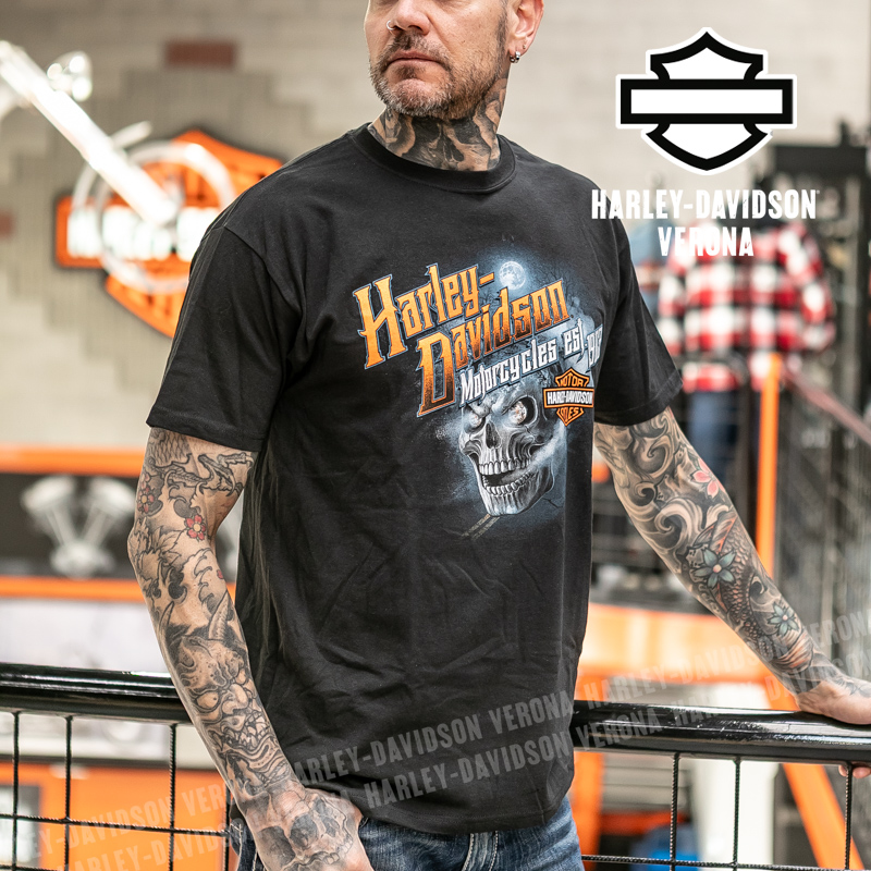 Indossa i colori di H-D® Romeo&Giulietta! Nuovissima collezione di t-shirt 2026 in total black con teschio e grafica in arancione, perfette per mostrare la tua appartenenza alla famiglia Harley-Davidson Verona o per un ricordo unico della tua visita alla città di Romeo e Giulietta! Sebastiano è alto 190cm e indossa la taglia L.