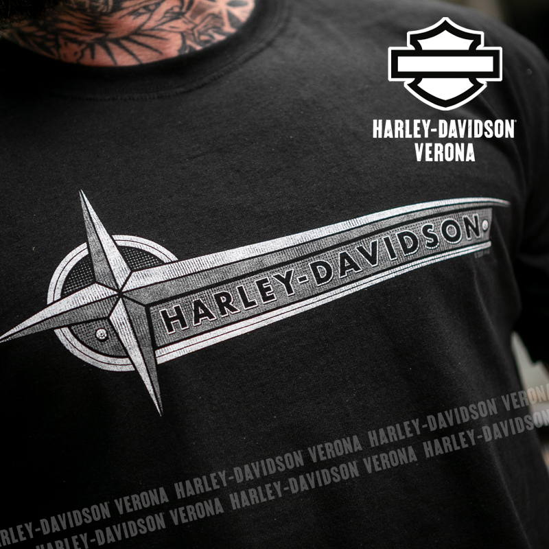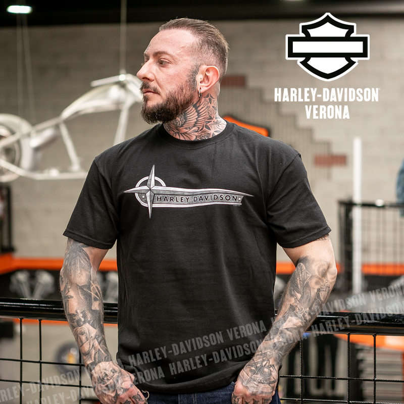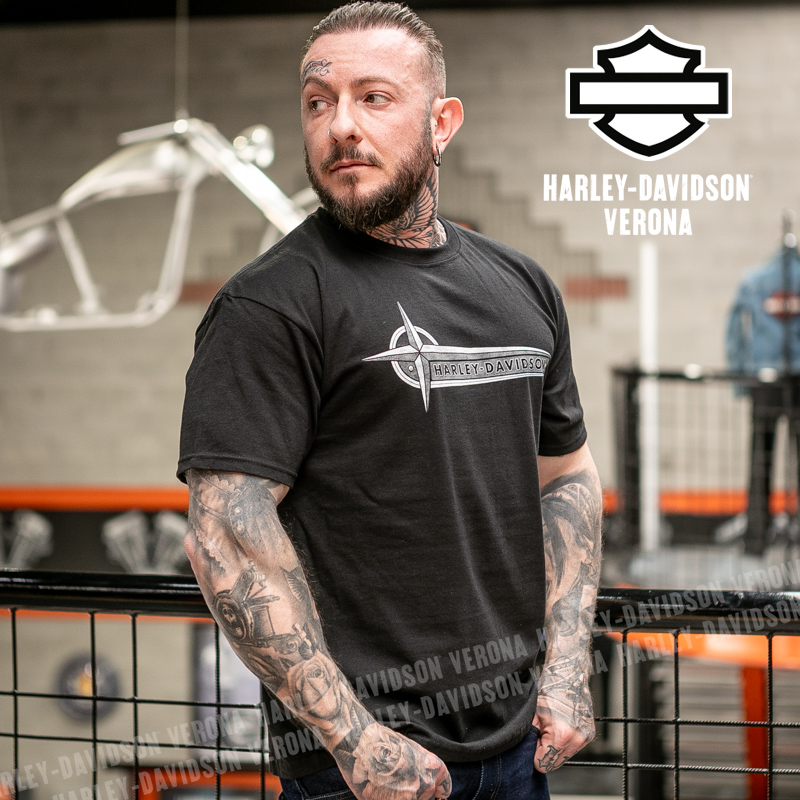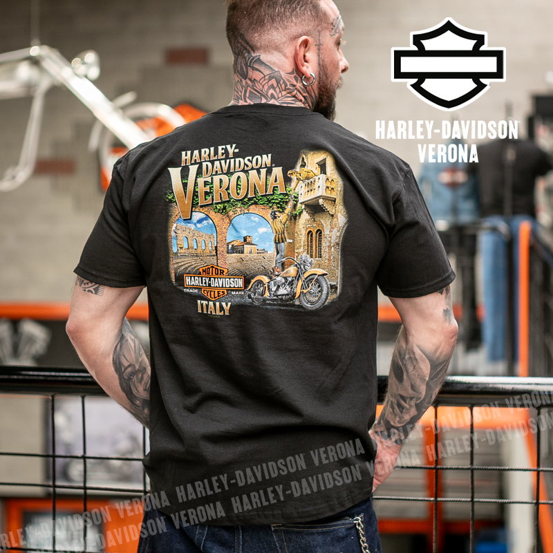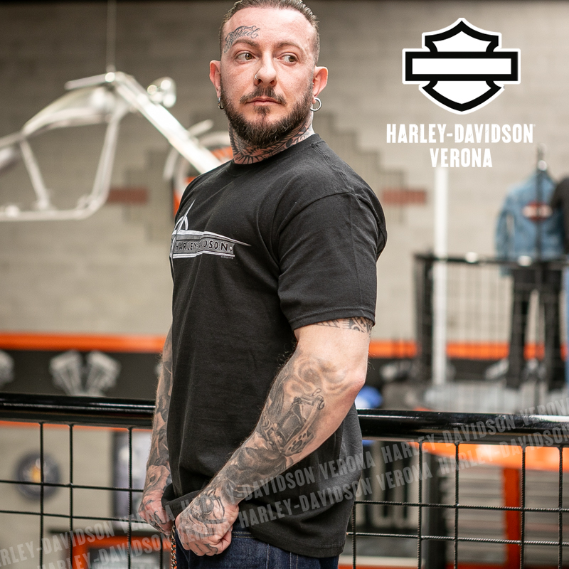 Indossa i colori di H-D® Romeo&Giulietta! Nuovissima collezione 2026 di t-shirt in total black con grafica ispirata al serbatoio delle nostre moto vintage, perfette per mostrare la tua appartenenza alla famiglia Harley-Davidson Verona o per un ricordo unico della tua visita alla città di Romeo e Giulietta! Davide è alto 180 cm e indossa la taglia L.
