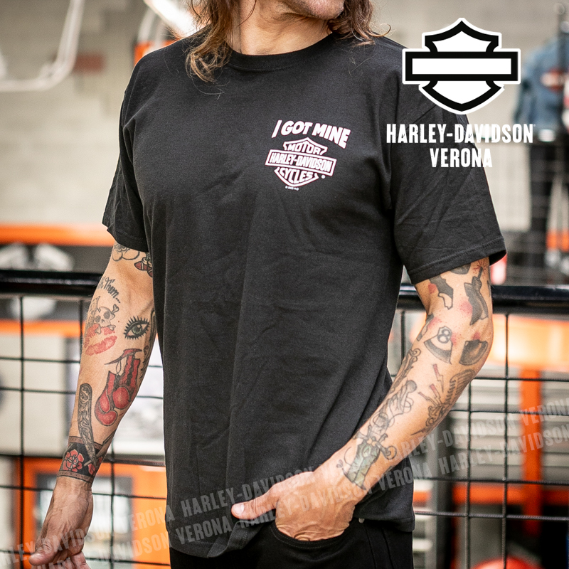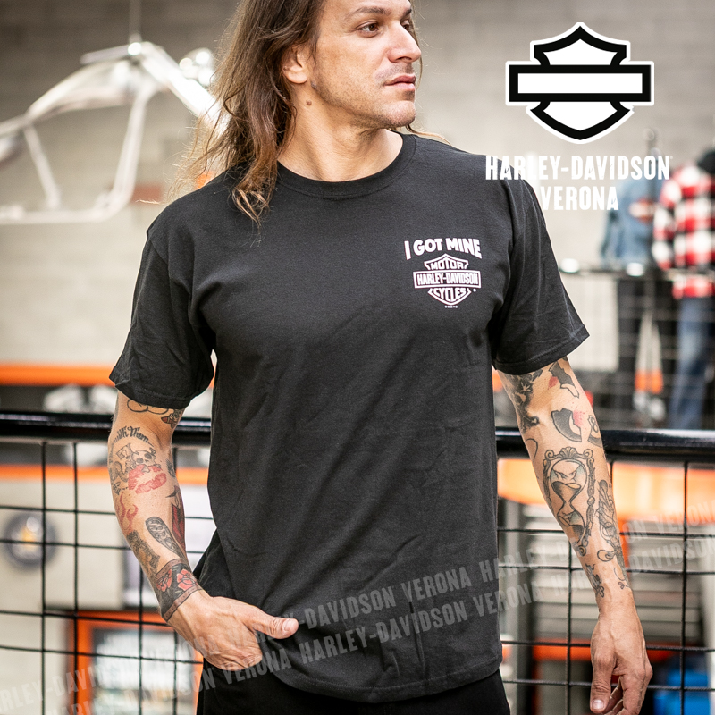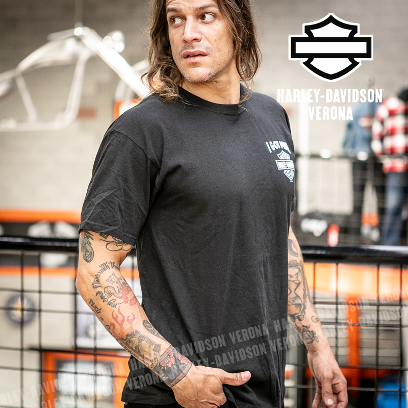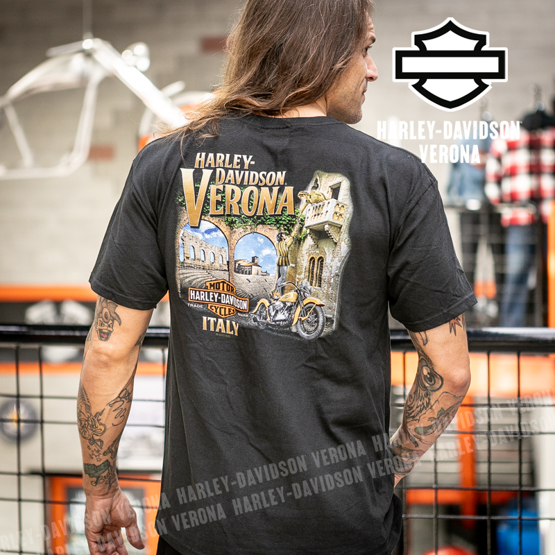 Indossa i colori di H-D® Romeo&Giulietta! Nuovissima collezione di t-shirt in color nero con grafiche bianche, perfetta per mostrare la tua appartenenza alla famiglia Harley-Davidson Verona o per un ricordo unico della tua visita alla città di Romeo e Giulietta! Timothy è alto 180cm e indossa la taglia L.
