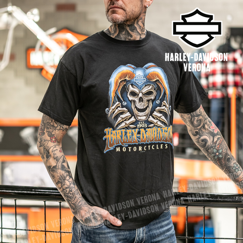 Indossa i colori di H-D® Romeo&Giulietta! Nuovissima collezione di t-shirt 2026 in total black con teschio in versione jolly dalle grafica neon in giallo e azzurro, perfette per mostrare la tua appartenenza alla famiglia Harley-Davidson Verona o per un ricordo unico della tua visita alla città di Romeo e Giulietta! Sebastiano è alto 190cm e indossa la taglia L.
