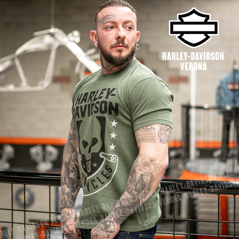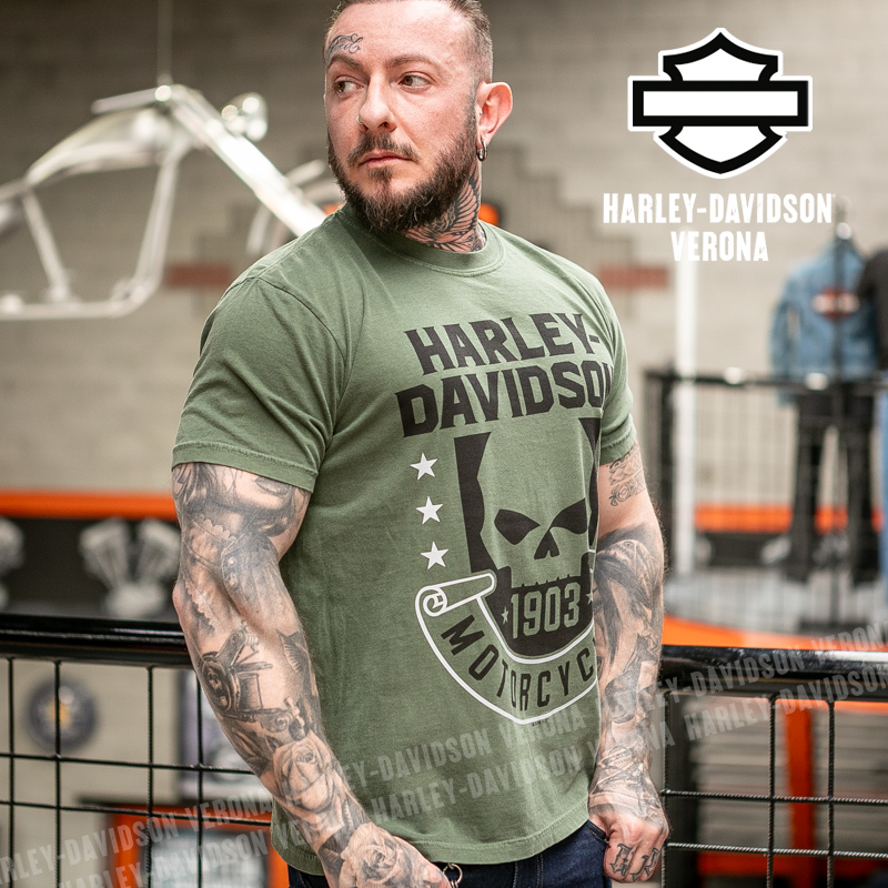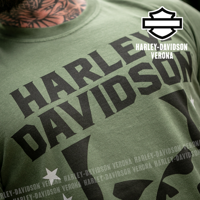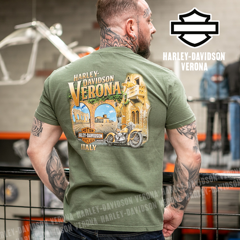Indossa i colori di H-D® Romeo&Giulietta! Nuovissima collezione 2026 di t-shirt in verde militare, con l’iconico teschio di Willie G e grafiche in nero, perfette per mostrare la tua appartenenza alla famiglia Harley-Davidson Verona o per un ricordo unico della tua visita alla città di Romeo e Giulietta! Davide è alto 180 cm e indossa la taglia L.