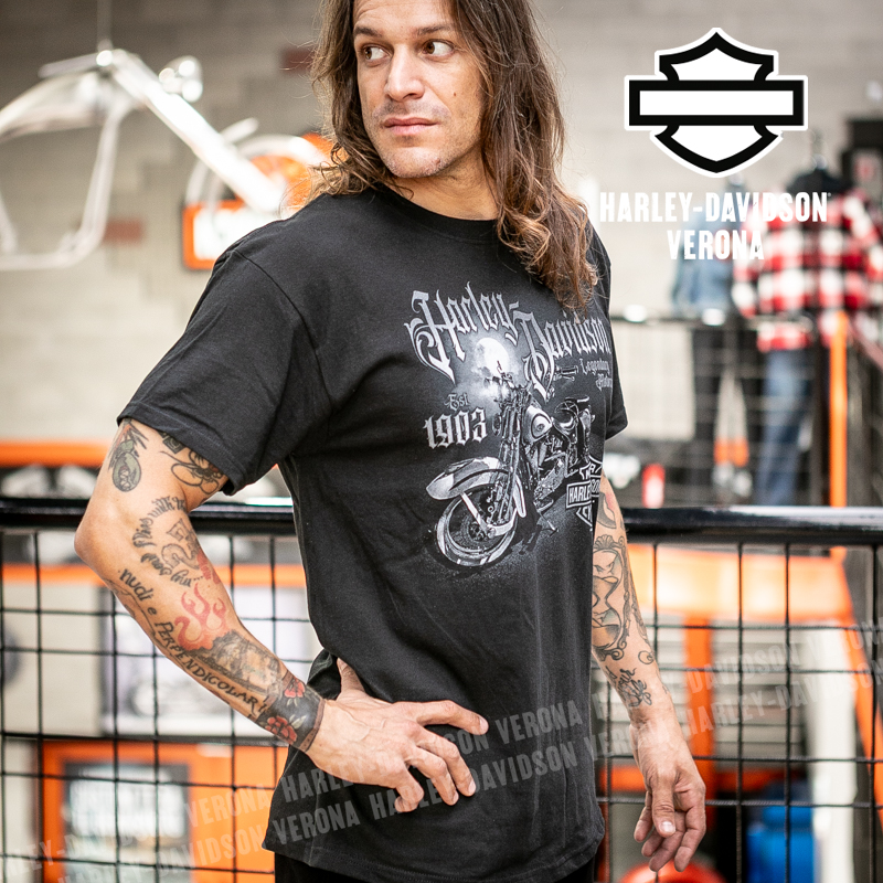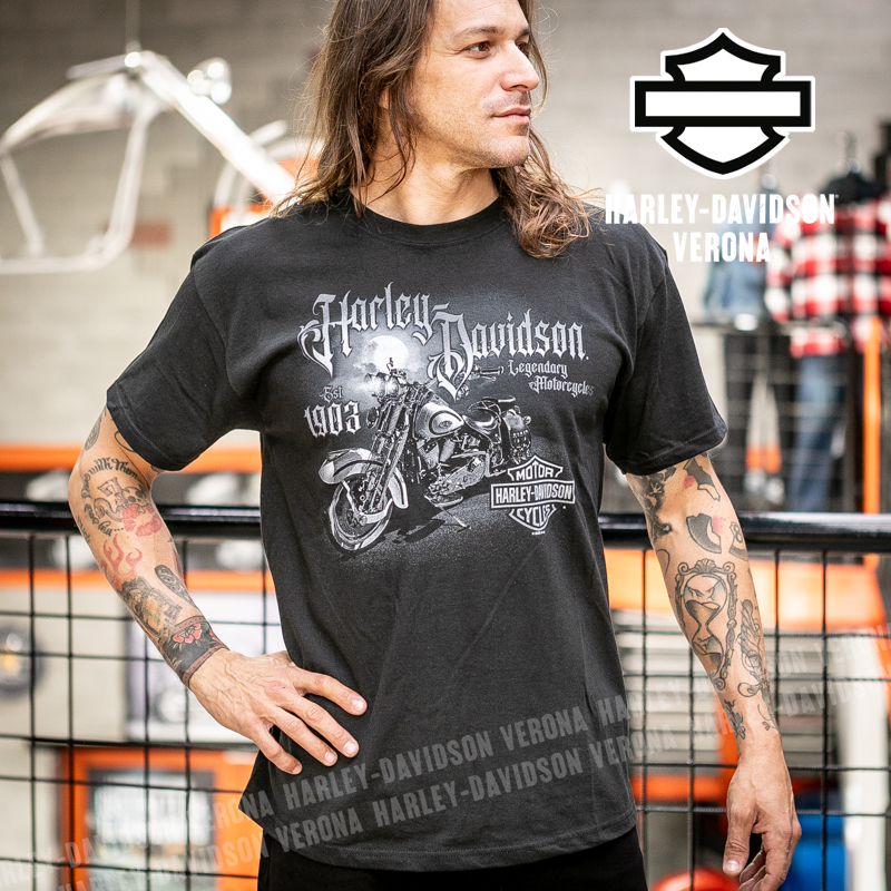 Indossa i colori di H-D® Romeo&Giulietta! Nuovissima collezione di t-shirt 2026 in total black con moto vintage e luna in grigio e scritta gotica di sfondo, perfette per mostrare la tua appartenenza alla famiglia Harley-Davidson Verona o per un ricordo unico della tua visita alla città di Romeo e Giulietta! Timothy è alto 180 cm e indossa la taglia L.