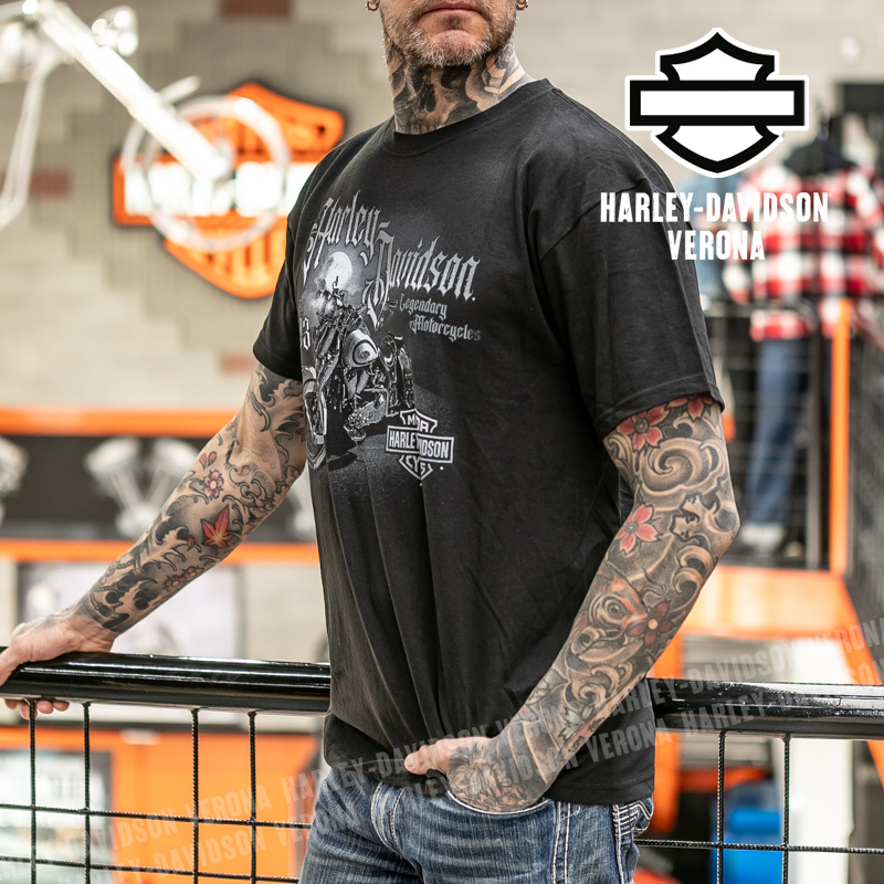 Indossa i colori di H-D® Romeo&Giulietta! Nuovissima collezione di t-shirt 2026 in total black con moto vintage e luna in grigio e scritta gotica di sfondo, perfette per mostrare la tua appartenenza alla famiglia Harley-Davidson Verona o per un ricordo unico della tua visita alla città di Romeo e Giulietta! Sebastiano è alto 190cm e indossa la taglia L.