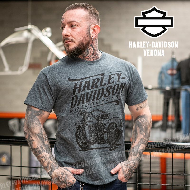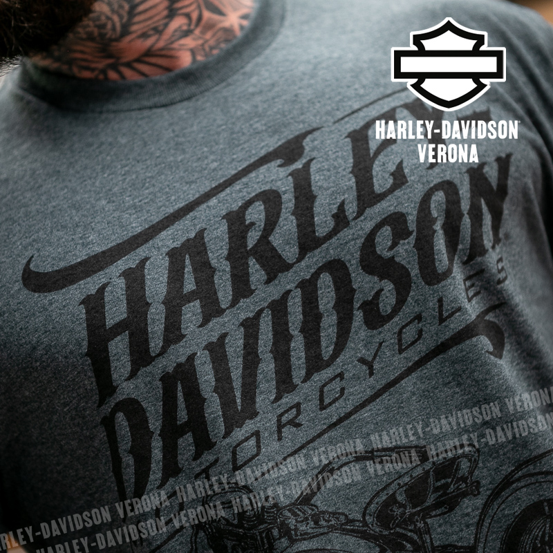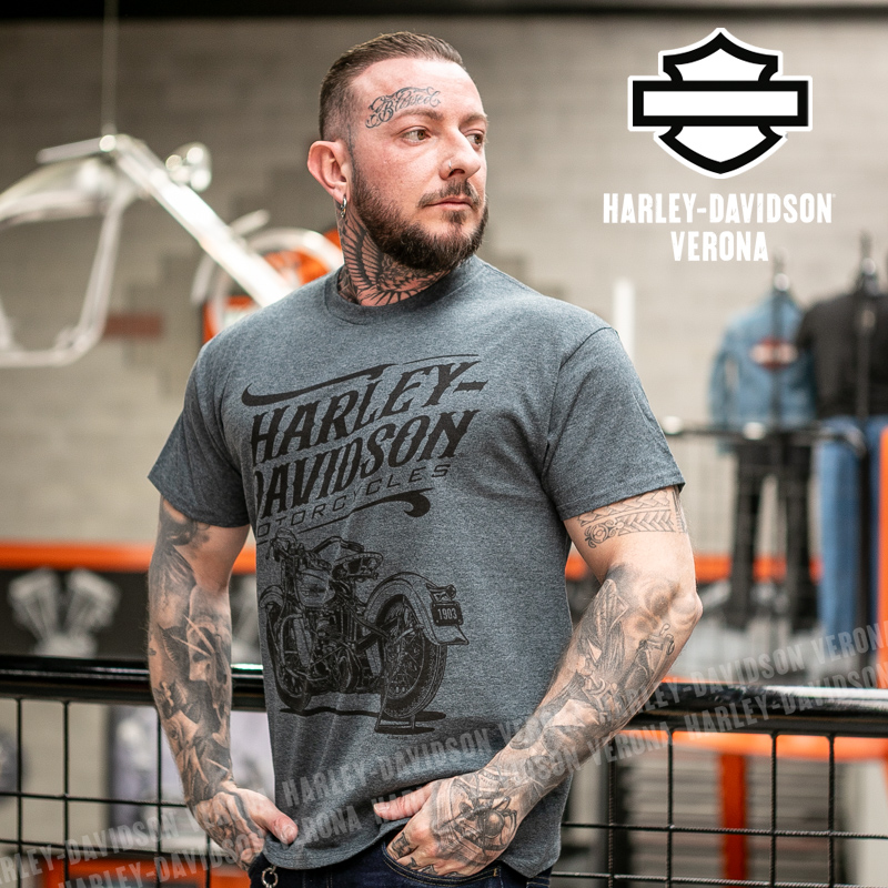 Indossa i colori di H-D® Romeo&Giulietta! Nuovissima collezione di t-shirt 2026 in elegantissimo grigio fumo con grafiche in stile vintage, perfette per mostrare la tua appartenenza alla famiglia Harley-Davidson Verona o per un ricordo unico della tua visita alla città di Romeo e Giulietta! Davide è alto 180 cm e indossa la taglia L.