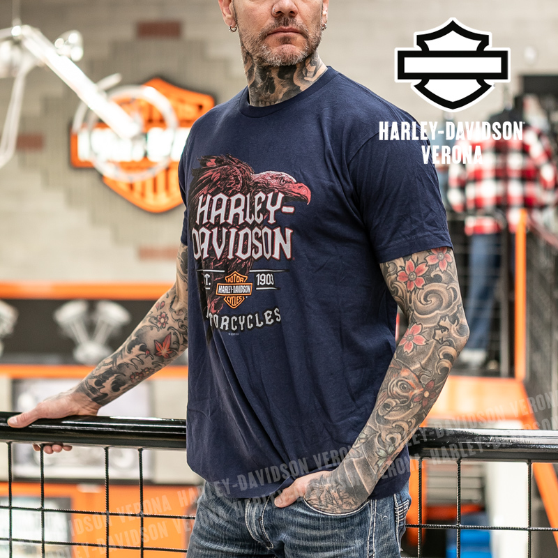 Indossa i colori di H-D® Romeo&Giulietta! Nuovissima collezione di t-shirt 2026 in blu con aquila in rosso sullo sfondo e scritte cubitali, perfette per mostrare la tua appartenenza alla famiglia Harley-Davidson Verona o per un ricordo unico della tua visita alla città di Romeo e Giulietta! Sebastiano è alto 190cm e indossa la taglia L.