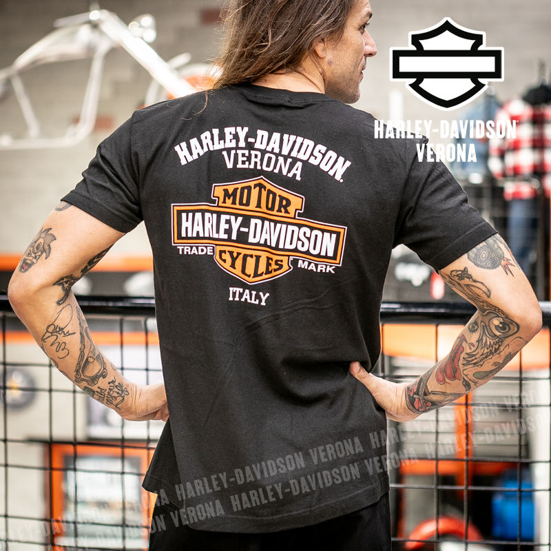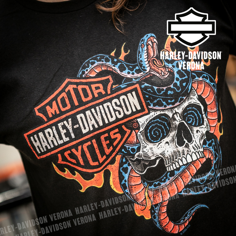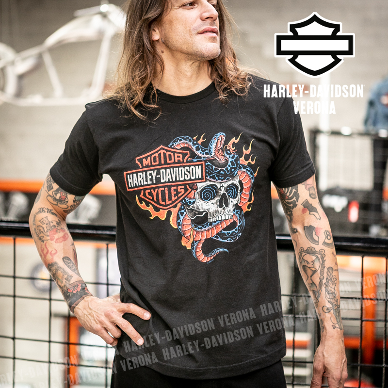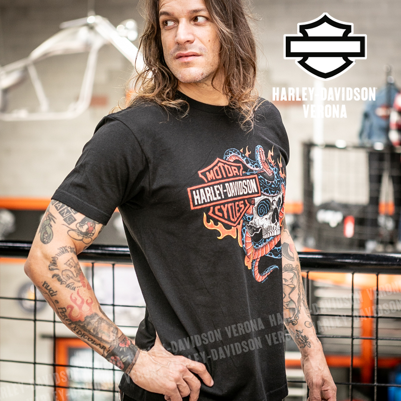 Indossa i colori di H-D® Verona! Nuovissima collezione di t-shirt 2026 in total black con teschio avvolto nelle spire di un serpente in fiamme affiancato dal nostro classicissimo Bar & Shield, perfette per mostrare la tua appartenenza alla famiglia Harley-Davidson Verona o per un ricordo unico della tua visita alla città di Romeo e Giulietta! Timothy è alto 180 cm e indossa la taglia L.
