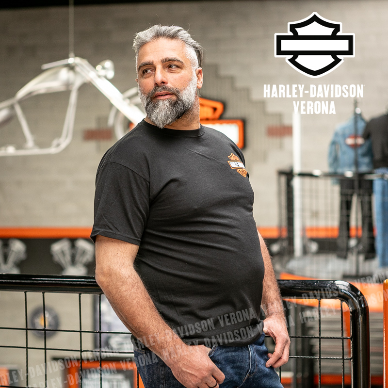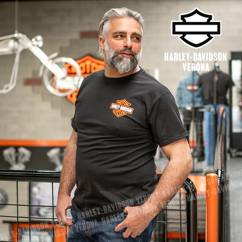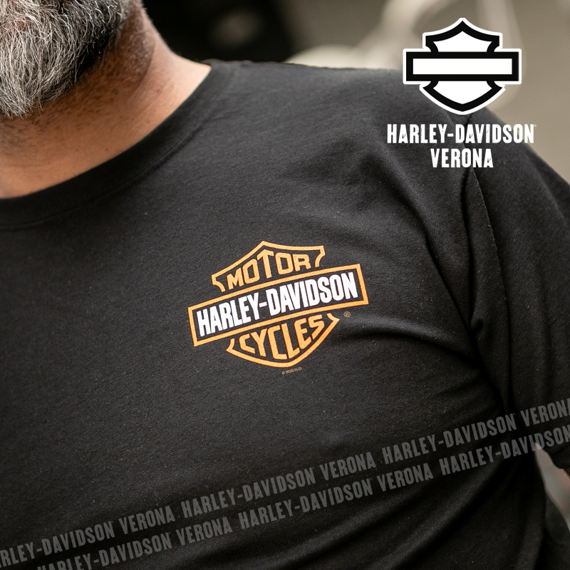 Indossa i colori di H-D® Verona! Nuovissima collezione di t-shirt 2026 in classico nero con raffinato Bar & Shield sul cuore, perfetta per mostrare la tua appartenenza alla famiglia Harley-Davidson Verona o per un ricordo unico della tua visita alla città di Romeo e Giulietta! Luca è alto 177 cm e indossa la taglia L.