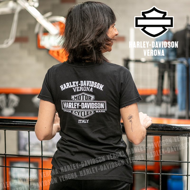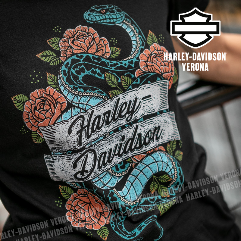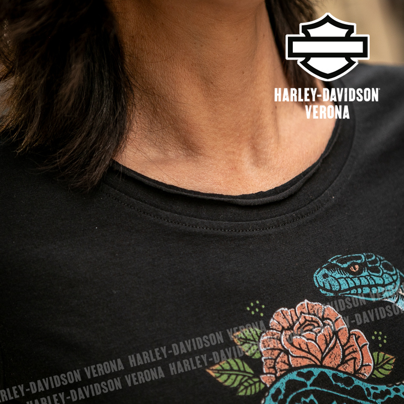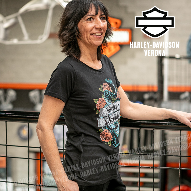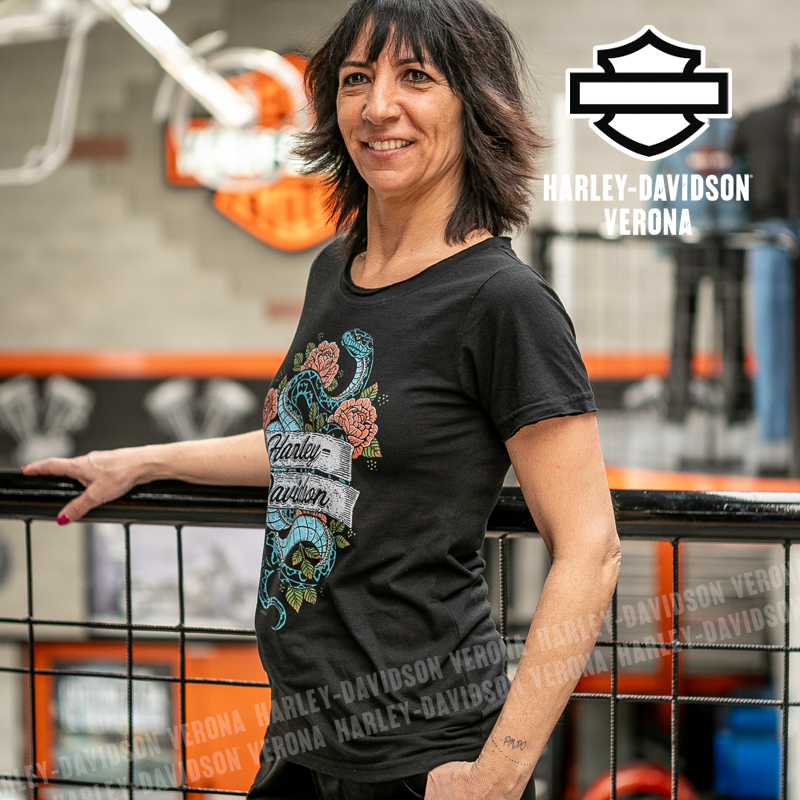 Indossa i colori di H-D® Verona! Nuovissima collezione 2026 di t-shirt in nero con grafica in stile tattoo con rose e serpente, perfetta per mostrare la tua appartenenza alla famiglia Harley-Davidson Verona o per un ricordo unico della tua visita alla città di Romeo e Giulietta! Sara è alta 165 cm e indossa la taglia XS.