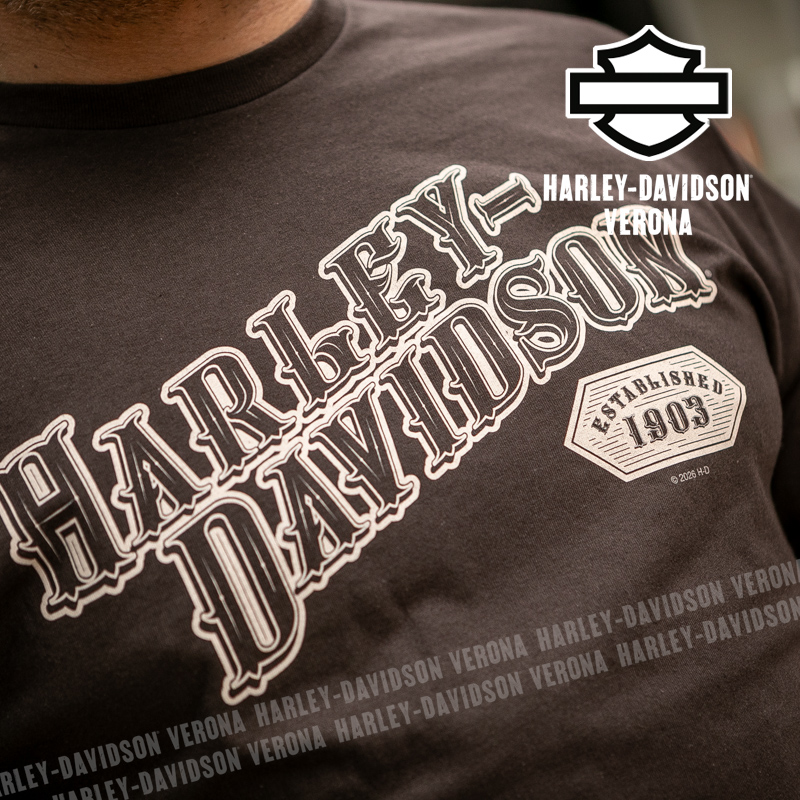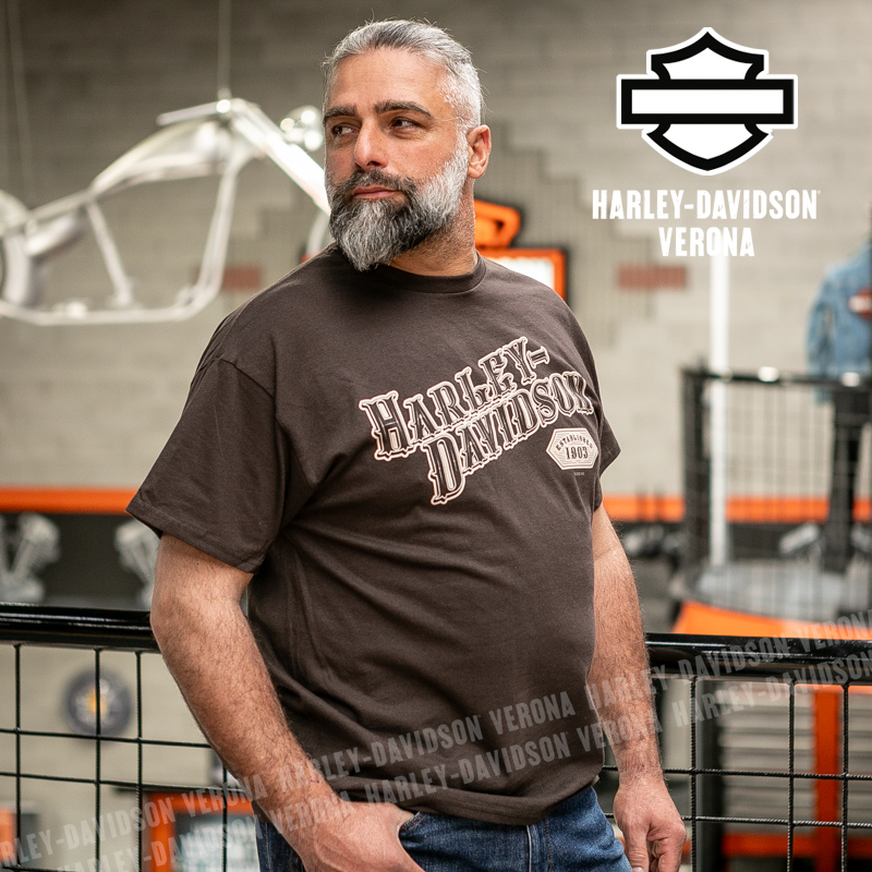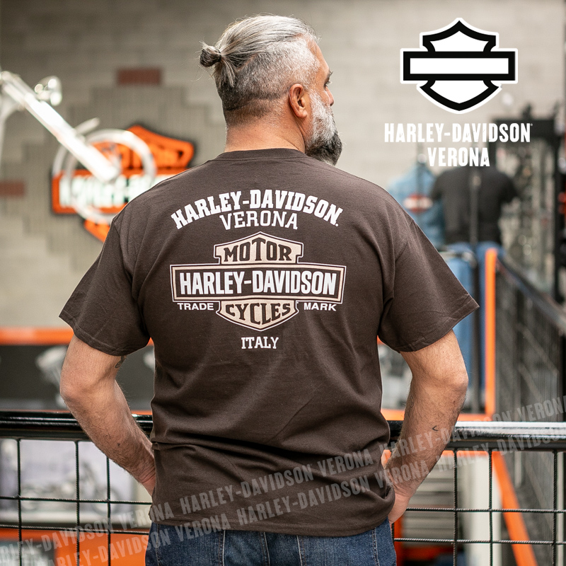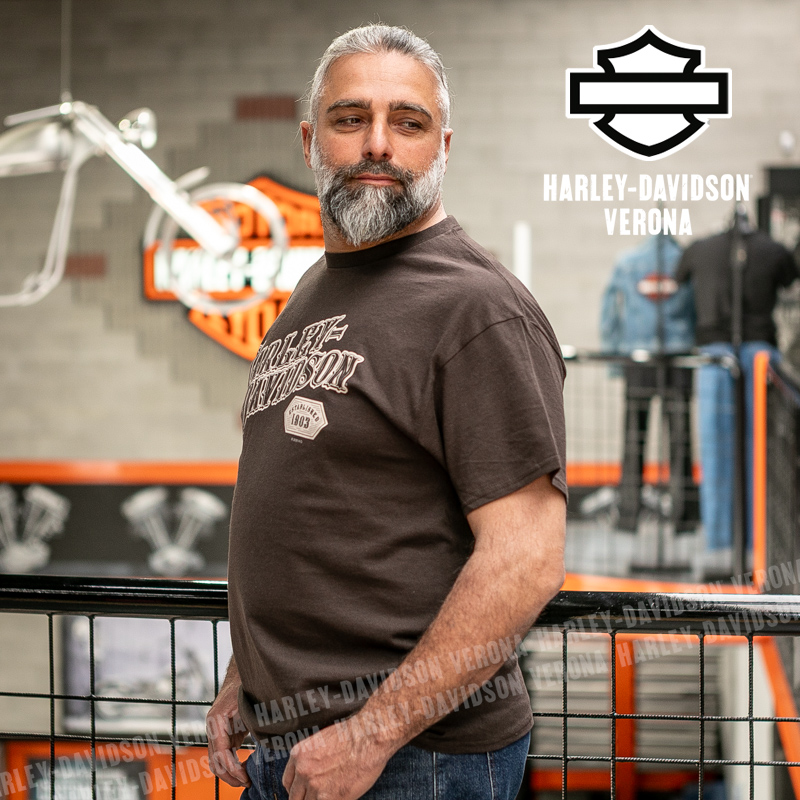 Indossa i colori di H-D® Verona! Nuovissima collezione 2026 di t-shirt in caldo color caffè con grafica vintage in tono, perfetta per mostrare la tua appartenenza alla famiglia Harley-Davidson Verona o per un ricordo unico della tua visita alla città di Romeo e Giulietta! Luca è alto 177 cm e indossa la taglia L.