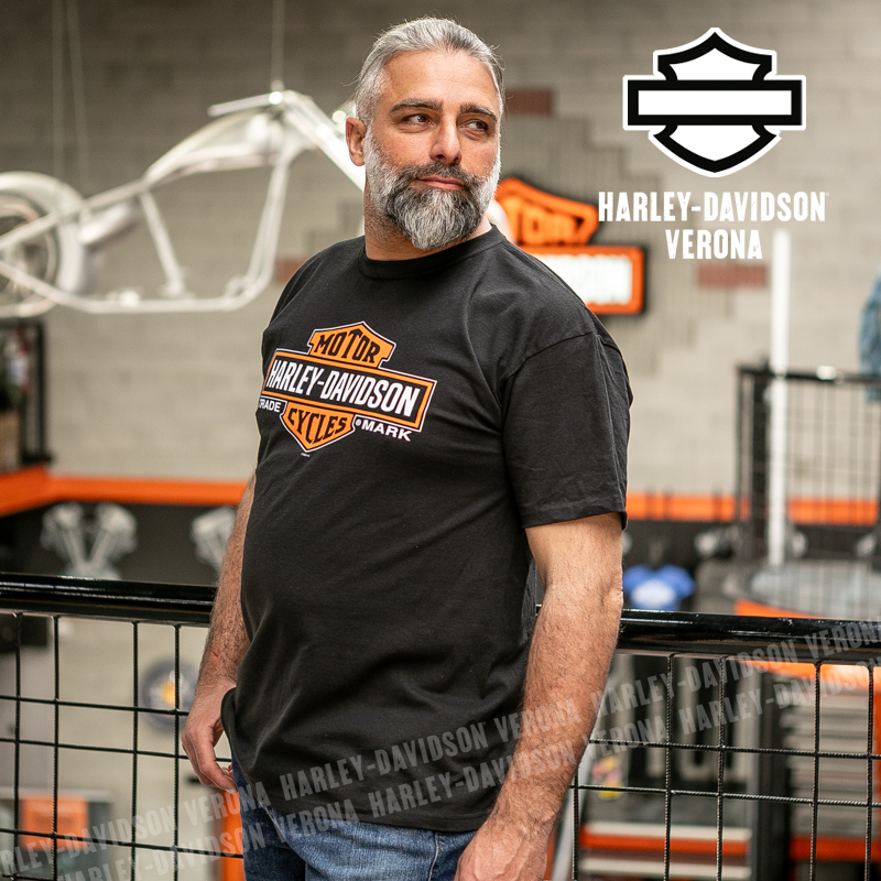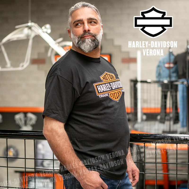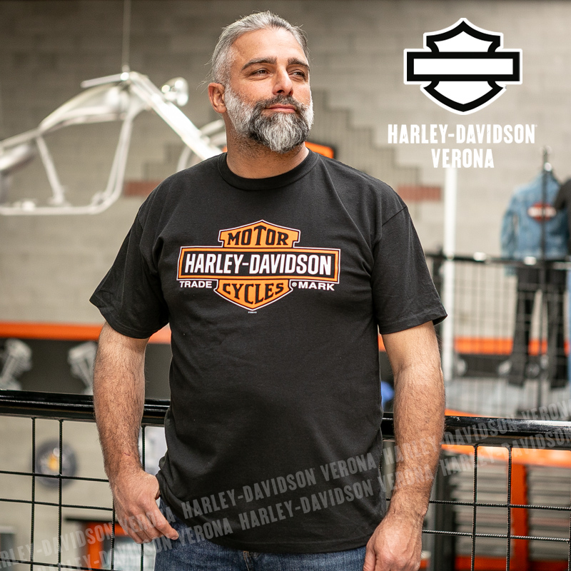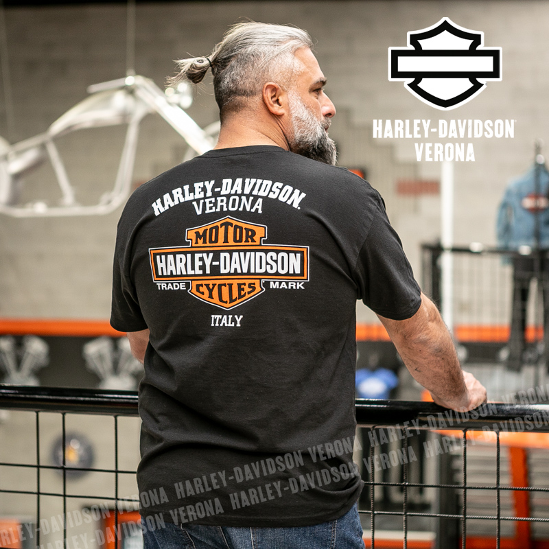 Indossa i colori di H-D® Verona! Nuovissima collezione di t-shirt 2026 in classico nero con stampa in tradizionale arancione e bianco del nostro amato Bar & Shield nella versione allungata, perfetta per mostrare la tua appartenenza alla famiglia Harley-Davidson Verona o per un ricordo unico della tua visita alla città di Romeo e Giulietta! Luca è alto 177 cm e indossa la taglia L.