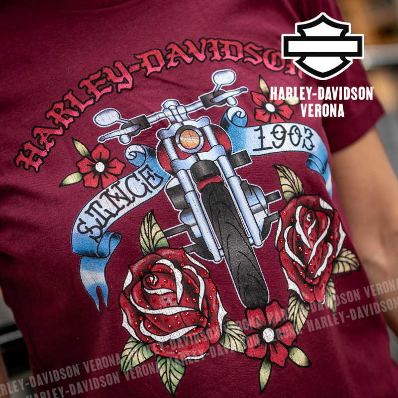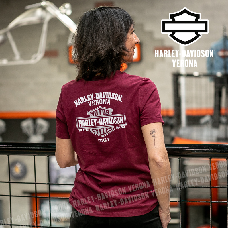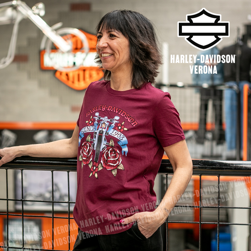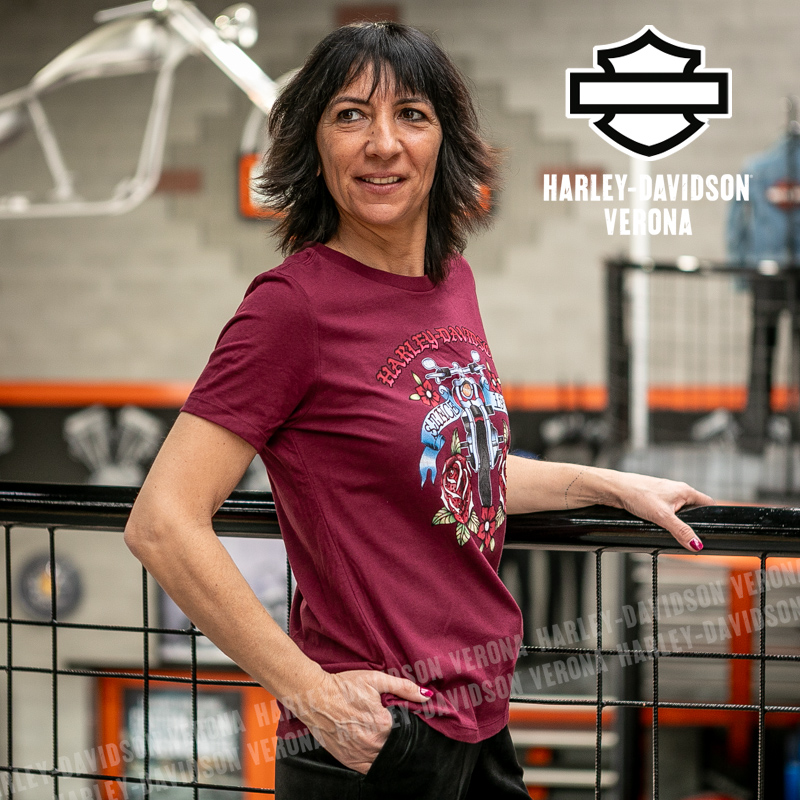 Indossa i colori di H-D® Verona! Nuovissima collezione 2026 di t-shirt in color bordeaux con grafica motociclistica e rose, perfetta per mostrare la tua appartenenza alla famiglia Harley-Davidson Verona o per un ricordo unico della tua visita alla città di Romeo e Giulietta! Sara è alta 165 cm e indossa la taglia XS.
